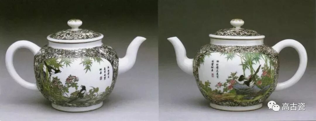 ▲清雍正 磁胎画珐琅节节双喜白地茶壶一对