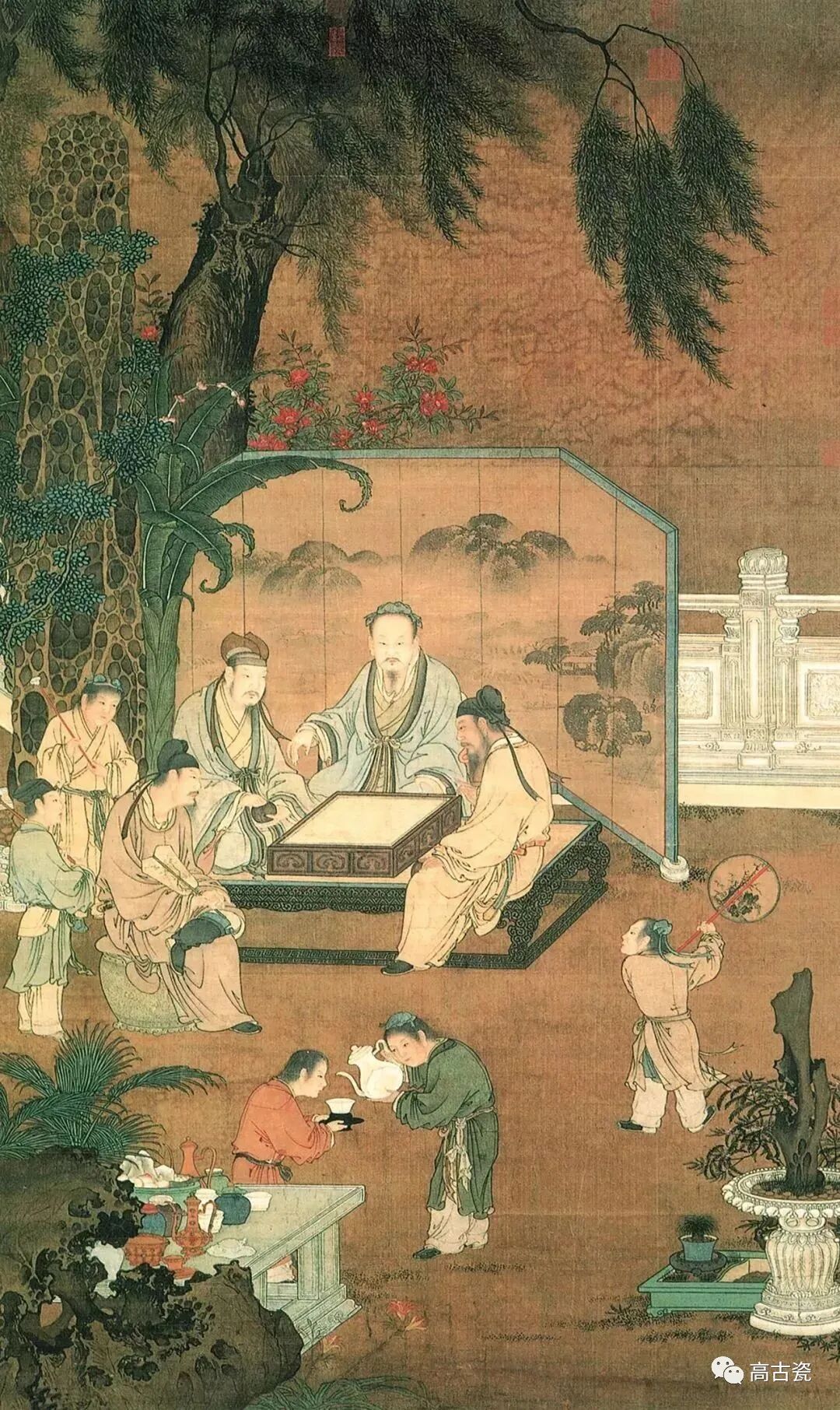 ▲明·仇英《东林图》局部,描绘了明代文人品茶场景