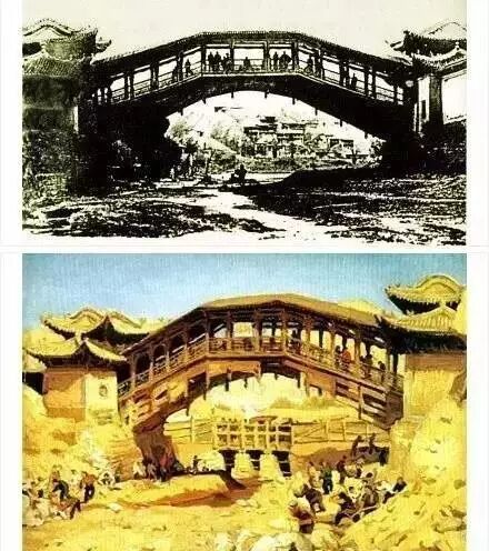 兰州雷坛河握桥,生于明永乐间,卒于1952年,为兰州八景之一“虹桥春涨”,因城市建设拆除,当时许多地方绅士出面阻拦未果。握桥建造方法特殊,在两岸堤坝插木,挑梁凌空对握,河中无柱,不惧水冲之患,称得上是建桥史上一次技术革命。