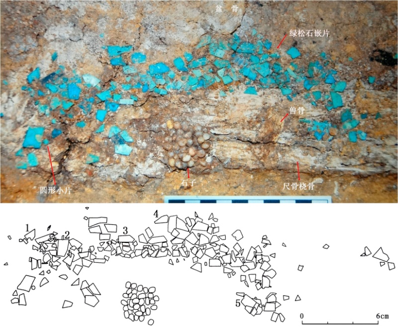 图二 两城镇M33镶嵌绿松石器及石子、兽骨的出土场景