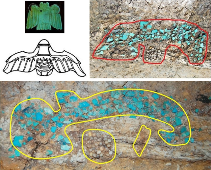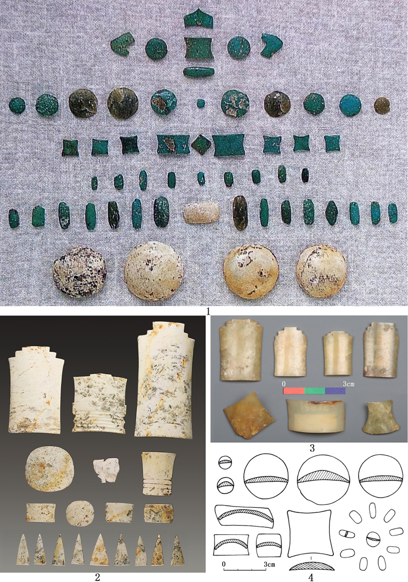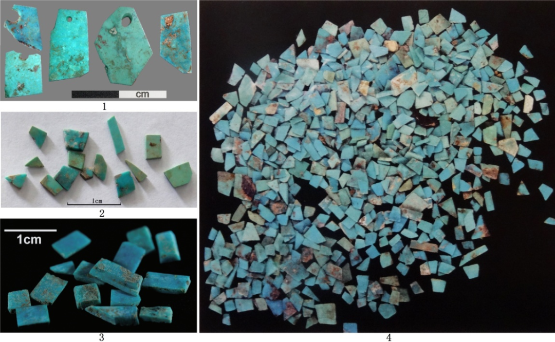 根据发掘报告的描述,这件器物的绿松石片之下没有发现明显的有机质类遗存。但仔细观察实物不难发现,绿松石片集中分布范围的整体轮廓呈现较为明显的弯弧状,石片的排列也相对比较规整,这意味着很可能是要表现某种图案或形象。我们推测,要使这个形象保持完整和持久不变形,应需要将这些石片镶嵌在某种较硬的承托物上。科杰夫通过室内对实物的检查发现,至少3件石片之下有黑色外皮,并据此推测石片应经过了“一些表面处理或胶粘的处理”。所以我们认为,这些绿松石片应是使用某种粘合剂镶嵌在木板之类承托物上的,亦即这些石片应是用于镶嵌的嵌片,只不过粘合剂和承托物因年久多已腐朽无存。这些嵌片中约有5件带穿孔或半穿孔(其中4件科杰夫已做了提取和分析,见图三,1),数量很少,推测应是穿孔坠饰残破后的再利用。这些嵌片之间的间隙较大,显得比较松散,推测可能是埋藏过程中粘合剂失去效力和棺内填土挤压导致了嵌片松动和移位,小型动物或微生物的活动很可能也是重要原因。