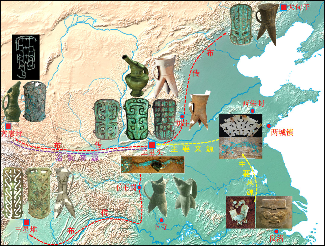 与此相反,在龙山—二里头时期来自周边地区传入中原的基本是工艺或技术层面,目前主要见有来自西北地区的冶铜、小麦种植、羊毛纺织、养马和造车以及冶铁等技术。应该承认,这些工艺技术的传入极大提高了生产力水平,对推动中原地区的社会发展和早期中国的文明演进具有重要作用,但是与礼制和礼器相比,这些工艺技术并非古华夏族经过长期探索和实践所产生的发明,也就不能单独构成早期中国的自身文化内涵,而是通过制作成为有形的礼器来反映早期中国在礼仪和宗教等方面的礼制和规定,才显现出这些工艺技术的存在价值。就这一角度而言,来自东方地区的礼器和礼制与来自西北地区的工艺和技术,应分别是早期中国的“体”与“用”,这可以说是发生在距今4000年前后中国历史上最早的“中体西用”变革。这一变革进程实际上反映出一条移植与汇聚之路,这条道路应该是早期中国形成机制中一个带全局性的特征。