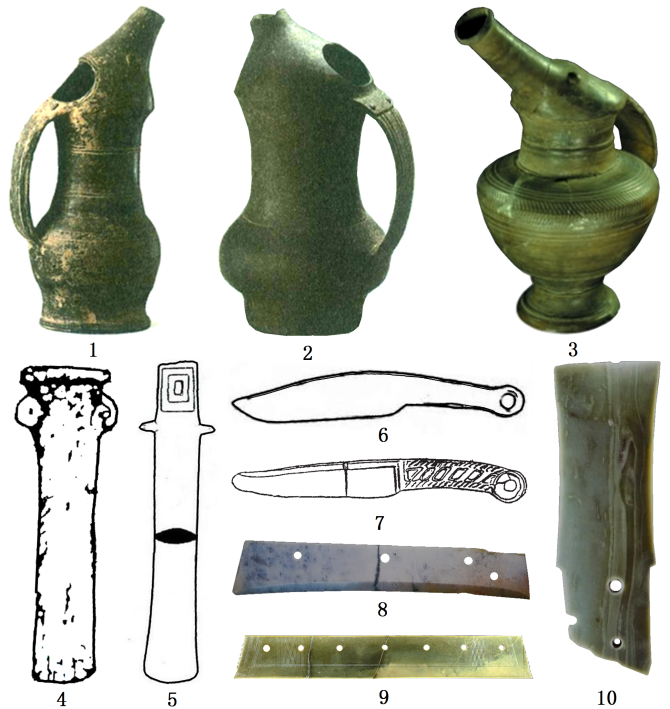 1.武山县陶盉 2.齐家坪陶盉 3.二里头陶盉 4.杏林铜斧 5.二里头铜斧 6.商罐地铜环首刀7.二里头铜环首刀 8.喇家玉刀 9.二里头玉刀 10.新庄坪玉璋