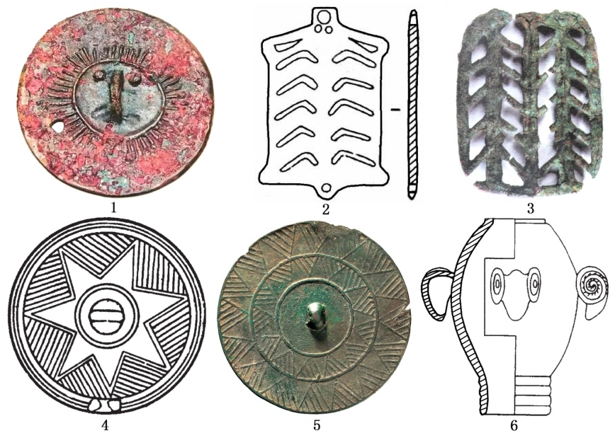 1、3.哈密天山北路出土牌饰 2.哈密腐殖酸厂出土牌饰 4、5.青海贵南尕马台出土、国博藏传出甘肃临夏铜镜 6.甘肃玉门火烧沟出土四羊首权杖头