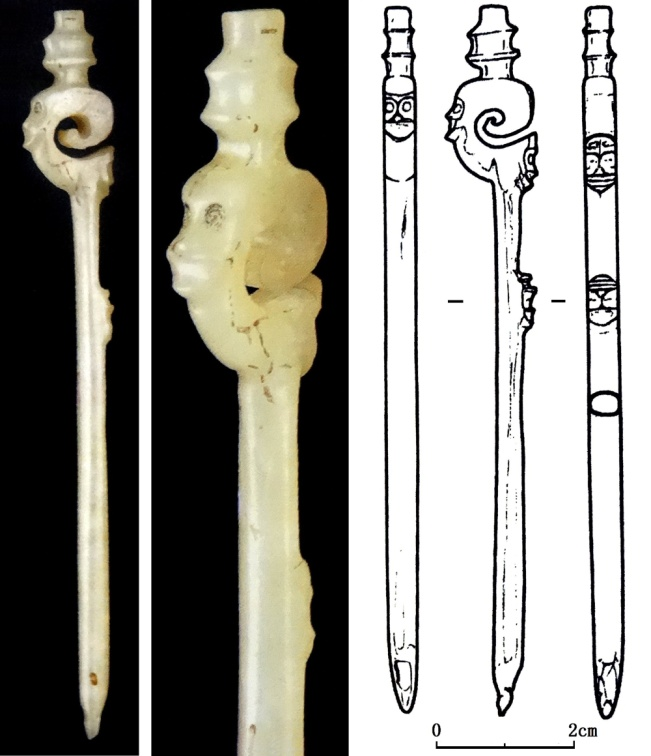 这件镶嵌绿松石器呈现出一定的形状,很可能是要表现某种图案或形象。科杰夫也这样认为,他把这件器物和内侧的那堆小石子联系起来考虑,并结合红山文化、石家河文化的鹰或鸟形玉器的有关发现,认为表现的是鸟形象,小石子代表鸟或鸡摄入的用于辅助消化的“胃石”或“砂囊石”(图四,上)(5)。笔者认为还有进一步分析的余地。从绿松石嵌片集中分布的范围和形状看,其一端明显较大,其中还可见1件圆形小嵌片,另一端则较小,并有向内弯曲的趋势,整体显露出一个扭动身躯的动物形象,较大的一端应代表头部,那件圆形小嵌片很可能是眼睛,较小的一端代表尾部(图四,下)。值得注意的是,早年在临朐西朱封遗址一座龙山文化大墓M202中曾出土了1件精美玉簪,近年对这件玉簪已有专门介绍(6)。其簪头以浅浮雕技法雕出3个神面形象,其中上部2个连为螺旋形的卷身,面部类似人面,但长身卷曲又非人类所有,显然要表现的是一个卷身神灵形象(图五)。这座大墓同属龙山文化中期,玉簪雕刻的卷身神灵形象与两城镇M33这件镶嵌绿松石器表现的形象和寓意具有可比性,其间的相通之处不可忽视,很可能是龙身(或蛇身)的神灵形象(7)。