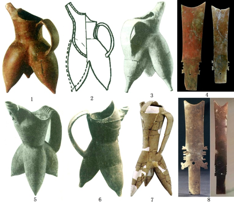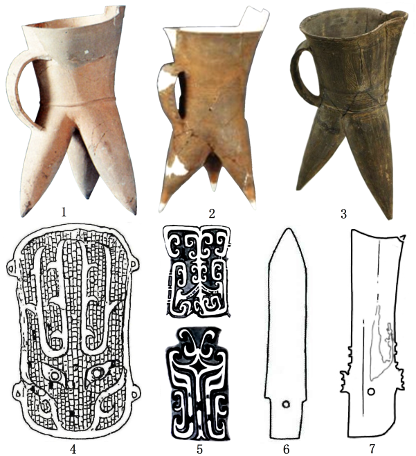 1.二里头陶鬶 2.刘庄陶鬶 3.大甸子陶鬶 4.檀香山铜牌饰 5.大甸子彩绘陶纹样 6、7.石峁玉戈和玉璋