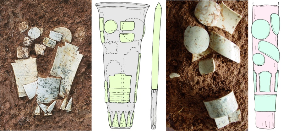 图八 好川M60(左)、M62(右)小玉片出土场景及其镶嵌复原图