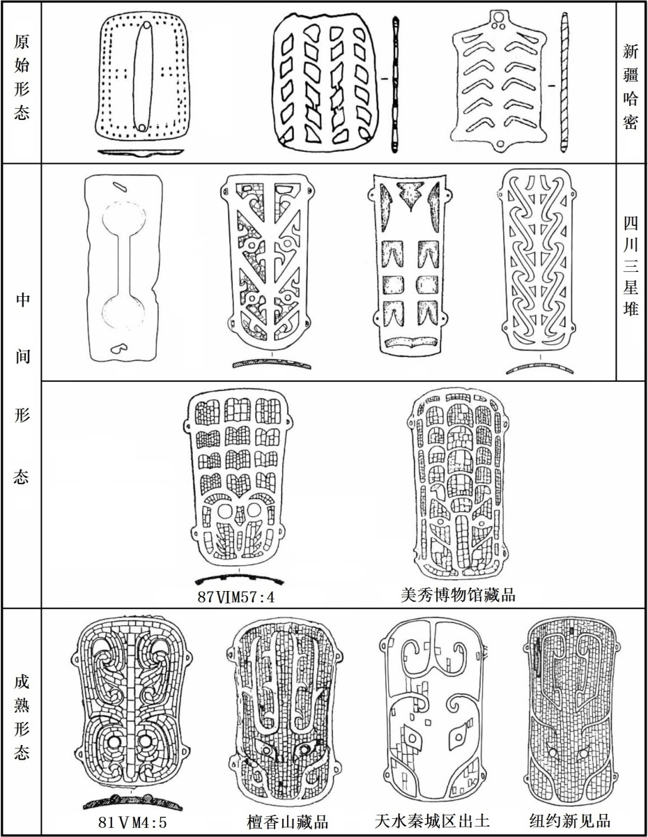 近些年来,西北地区陆续出土了几件镶嵌铜牌饰,进一步扩大了此类牌饰的分布范围,同时也促使人们关注早期中西文化交往问题以及铜牌饰的起源及传布问题。陈小三近年曾以新疆出土的早期铜器及甘肃等地出土的铜牌饰,主张此类牌饰应起源于西北地区,再辗转影响到中原地区,才出现了二里头遗址所见的此类牌饰(40)。他将新疆出土的早期铜牌饰视为此类牌饰的“原始形态”,但本文已讨论了新疆及西北的早期铜器流行写实性自然物装饰纹样,缺乏抽象的兽面神灵纹样,因此不会是二里头铜牌饰的形象寓意的源头。而他列为中间形态和成熟形态的镶嵌铜牌饰中,相互之间缺乏形制演变的明确轨迹,如将原属二里头文化二期的二里头81ⅤM4:5铜牌饰列为成熟形态,而将原属二里头文化四期的二里头87ⅥM57:4铜牌饰列为原始形态向成熟形态过渡的中间形态,再如将一般认为属于商代的三星堆遗址出土的铜牌饰列为中间形态的较早阶段,都反映出年代前后的矛盾和形制演变的矛盾(图十二)。笔者认为,这些相关的镶嵌铜牌饰都应属于二里头文化四期及其以后,因此他所谓的起源问题实际上应是传布问题。以下就从甘肃近年新公布的2件铜牌饰入手,针对有关牌饰的所在年代及传布背景展开讨论,考察此类牌饰的传布过程。