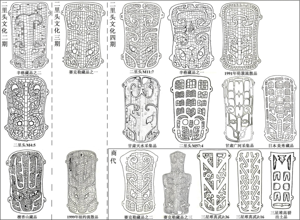 除了二里头遗址已出土的3件镶嵌铜牌饰,以及上述甘肃2件采集品和三星堆3件出土品之外,还有早年出土已流失海外的9件,这些牌饰的年代笔者此前多有分析(51),其中辛格第2件可能在二里头文化二期,余者多断在二里头文化三四期。这样,目前已刊布的镶嵌铜牌饰共计17件(含广河新见1件),我们按照年代先后综合列为图十五。由此图可知,有两类牌饰的演化轨迹比较有规律,一类是辛格第2件藏品→赛克勒第1件藏品→二里头M11:7→辛格第1件藏品→1991年伦敦流散品,另一类是二里头M57:4→日本美秀藏品→甘肃广河采集品。这两类牌饰的下半部都是兽面,上半部的纹样则有区别,但是演化轨迹都是下半部的面积占整个牌饰的面积由小渐大,上部纹样占的面积则由大渐小,以二里头的2件出土品的年代为参照,这种演化从二里头文化二期延续到四期一直比较清晰。对照这一演化轨迹,笔者此前曾认为3件年代不好判断的牌饰,即高骈出土品、1999年伦敦流散品和檀香山美术馆藏品,现在看,高骈出土品根据同出玉器可断在商代或者更晚,伦敦和檀香山这2件的下部兽面所占面积较小,上部面积却较大,与二里头M4:5这件牌饰有相似之处,将其年代断在二里头二期或三期可能较为适宜(图十五)。