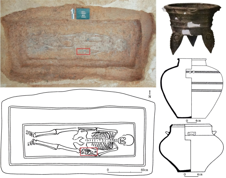 图一 两城镇M33及镶嵌绿松石器、石子、兽骨(手腕处方框内)和部分随葬陶器