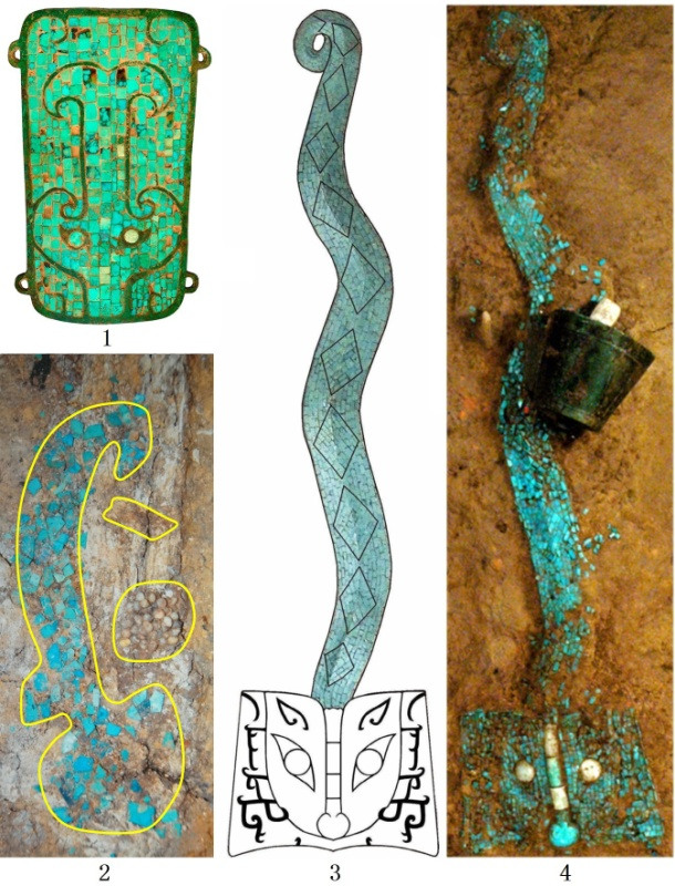 (1.保罗辛格藏镶嵌铜牌饰 2.两城镇M33镶嵌绿松石器 3、4.二里头03ⅢM3镶嵌绿松石龙形器及其复原)
