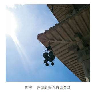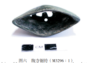 陶寺遗址还出土过陶铃,邓玲玲研究认为陶铃无法发出音乐的声响,很可能不是乐器,使用痕迹也不支持作为响器使用。陶铃出土地点同窑址的分布联系紧密,推测与制陶业的从业人群有关,陶铃很可能是陶器生产负责人身份的象征物,是一种不以原料、技术和装饰为依凭的特殊权威物品。笔者个人认同陶铃本身不能作为响器的分析,但是陶铃仅见于遗址,不见于墓葬,因此作为陶官身份的象征物似缺乏直接的证据,从使用痕迹特征推测,更有可能用作风铃式响器伞盖。(图五)但是,陶寺铜铃确实出自早期王族墓地的晚期偏晚小墓M3296男性墓主的腰部,铜铃合瓦形红铜范铸,顶部有漏铸缺陷,于是在顶部中央偏一侧钻一小孔,以便系铃舌。(图六)诚然,铜铃形态仿自陶铃,但是由于材质的变化,更适于发声;而金属的光泽更为礼仪场合增色,因此,铜铃应是从陶铃外形改造而来的金属乐器。