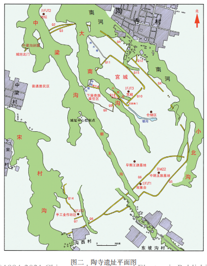 陶寺早期遗址总面积约160万平方米,距今4300至4100年。以13万平方米宫城及南外侧下层贵族居住区小城(近10万平方米)构成核心区。(图二)宫城有结构复杂的曲尺形角门,宫城内已发现疑似“冰窖”附属建筑。下层贵族居住区小城内已发现双开间半地穴式住宅。宫城东西两侧为普通居民区,宫城东侧有大型仓储区。宫城东南为早期王族墓地,已发掘王墓6座,随葬品在百件以上,出土有龙盘、彩绘木器、玉石钺、大厨刀、彩绘陶礼器、日用陶器等。大贵族墓数10座,随葬品数10件,包括磬、鼓等礼乐器组合,彩绘陶器和日用陶器。其余近千座小墓几乎没有任何随葬品。阶级对立状况凸显,金字塔式社会结构清晰。都城的结构与性质初步具备。