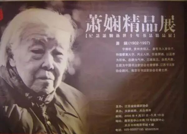 萧娴(1902-1997),中国当代最为著名的女书法家,字稚秋,号蜕阁,署枕琴室主,贵州省贵阳市人,父亲萧铁珊是孙中山先生的追随者,又是著名的南社社员,工诗文,善书画;萧娴幼承庭训,小小年纪就以善作擘窠大字闻名乡里;1964年被吸收为江苏文史馆馆员,1981年,江苏省南京市文联为她在江苏美术馆举办书展,历时一月盛况不衰,这次书展充分显示了她的艺术水平和风格,是建国以来江苏省最盛大、历时最长、观众最多的书展之一。贵阳市翠微阁观有为萧娴作品陈列馆。