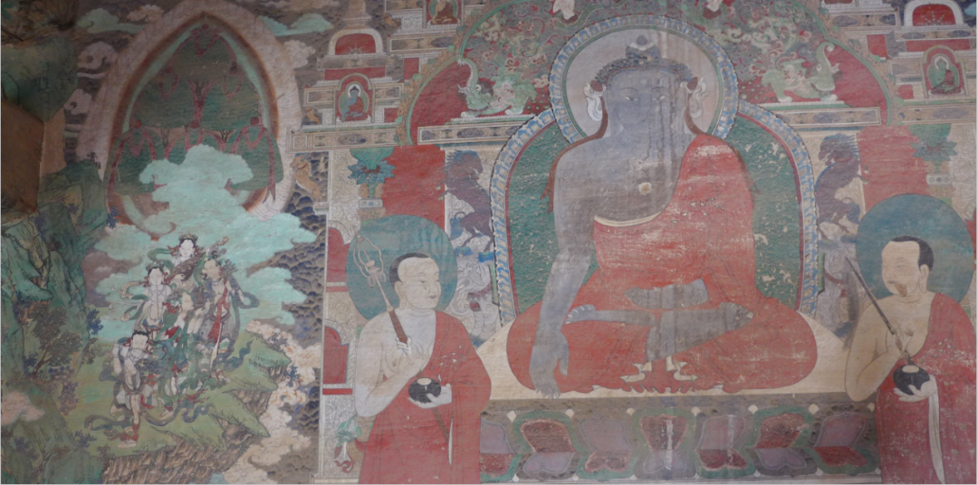 瞿昙寺回廊壁画最后一铺壁画与《胆巴国师》没有内容上的关联,“意图”却颇近似。此图采用较为古老的藏传佛教艺术形式绘制世尊坐像,龛像设置在两座高山夹持的环境当中,山顶伎乐鼓动,喜庆吉祥。不仅佛像,环境中的伎乐人物也因为西藏绘画的造型特点,迥然有别于回廊壁画主体风格。藏式龛像,佛陀持降魔触地印,象征佛教在西藏地区的兴立。