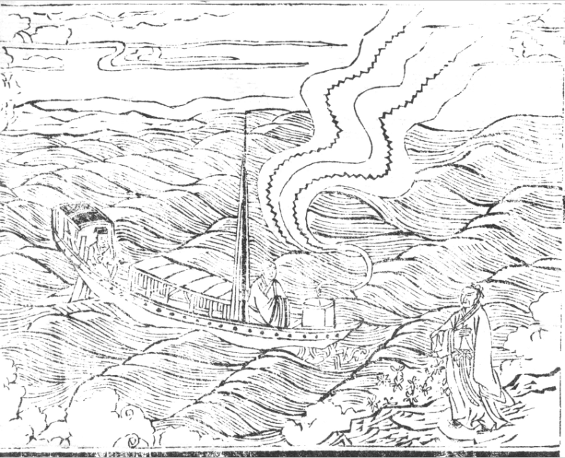 瞿昙寺达摩乘舟图式见于《释氏源流》下部题为“还国传法”的另外一幅版画(图 6)。《释氏源流》中《还国传法》与达摩全无关系,注释引《高僧传》云 :