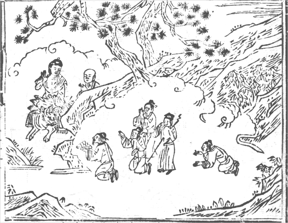 《释氏源流》中《纯陀后供》描绘世俗信众礼拜世尊之景:佛陀骑牛,携一弟子转过山岗, 五个男居士或站或跪,礼拜供养。《释氏源流》在版画旁边刊刻注释,引用《大般泥洹经》如下: