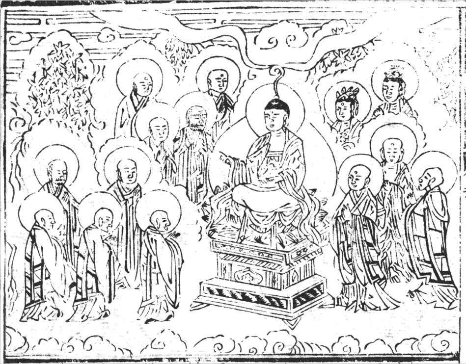 当然,两幅图像之间也有明显的区别。《纯陀后供》版画,佛陀乘牛转过山岗,而《佛法东流》壁画中,佛陀坐在莲花宝座之上,身边环绕众多比丘菩萨。《佛法东流》壁画前景人物,除了礼拜佛陀的六个 居士,旁边尚有两个比丘和一个居士,站立在佛陀前方偏右的位置。在图像叙事上,他们不同于世尊身后的随从,而与佛陀及纯陀形成某种三角关系。他们目睹佛陀为纯陀说法,一个比丘回头与身后之人窃窃私语。