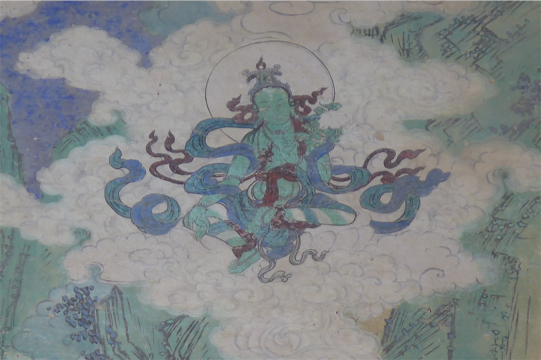 瞿昙寺回廊佛传中绿度母仅此一例,她出现在《付嘱诸天》中,人物风格和尊格都略显突兀,显然也是汉藏结合而有意为之的添加。如前所述,瞿昙寺画家在回廊壁画的最后一段,沿着佛法东流华夏的思路,考虑了佛教传播西藏之事。不排除画家在呈现世尊嘱咐诸天,令其在末法时代护持佛法这一观念中,也采纳了西藏传说,在世尊“付嘱诸天”的天界边缘绘制绿度母,预示文成公主将在佛教初传雪域之时出现。
