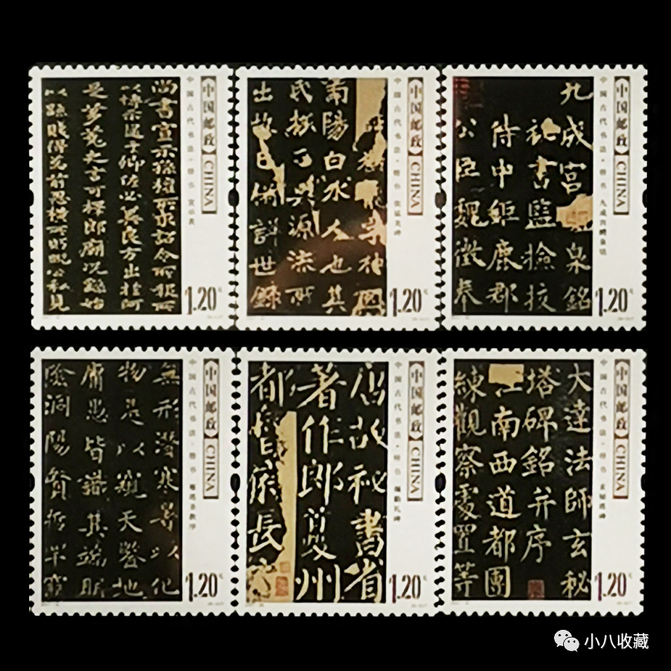 中国邮政从2003年开始发行《中国古代书法》系列邮票,到2011年结束,期间一共发行了5套邮票,包含篆、隶、楷、行、草五种书体。主要以中国古代碑贴为主。