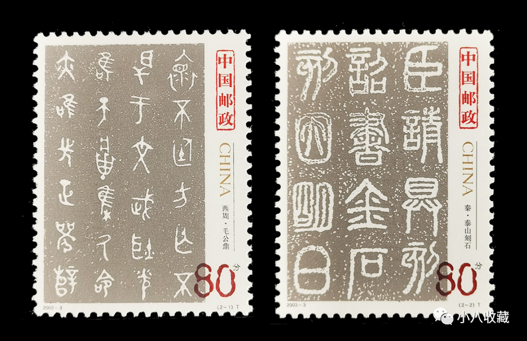 中国邮政于2003年2月22日《中国古代书法——篆书》特种邮票一套2枚,名称分别是:西周·毛公鼎、秦·泰山刻石。