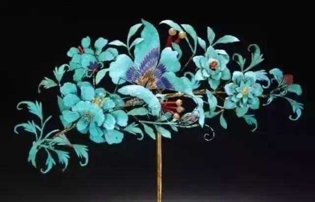 点翠,是我国传统首饰工艺,就是将翠鸟的羽毛粘贴在金银制成的底座上,形成花朵、蝴蝶等吉祥图案,非常精细繁琐,现在差不多快绝迹江湖了: