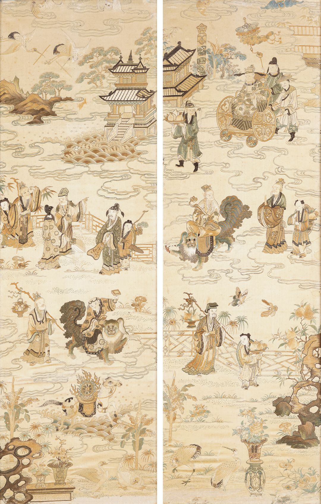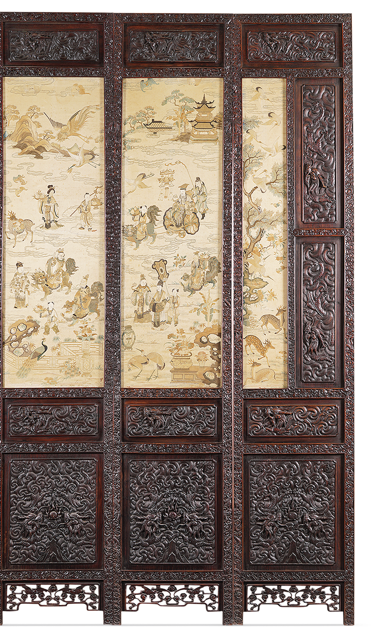 清中期 红木雕云龙框盘金粤绣群仙祝寿图十二扇屏风一套估价:RMB 1,800,000-2,800,000