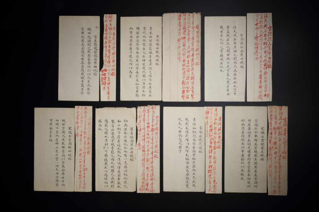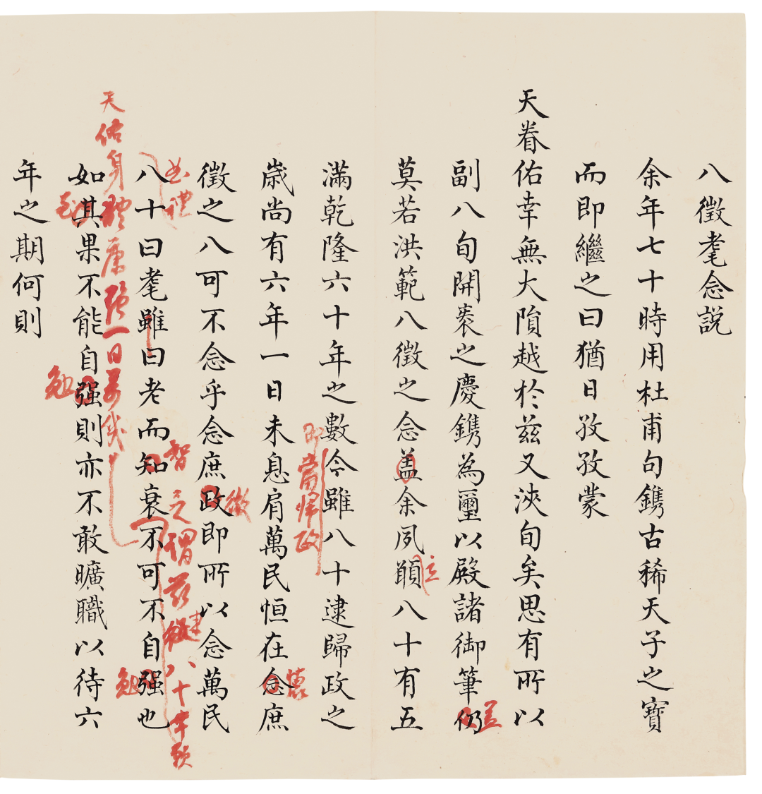 清乾隆 御笔诗文稿“八徵耄念之宝记”等六十四纸、崇庆皇太后八旬万寿祝寿颂词册页展览:保利艺术研究院、保利艺术博物馆,“弘历的世界——乾隆御制诗文稿、兰亭图帖缂丝卷暨重要宫廷艺术特展”,北京,2021年04月23日-05月10日出版:保利艺术研究院、保利艺术博物馆编:《弘历的世界》,上册,上海书画出版社,2021年 词臣楷书御制文“皇太后八旬万寿鸿称积庆颂并序”册页乾隆御稿,即指故宫博物院庋藏的乾隆帝手稿和手稿誊写本,因存放这批手稿和誊写本的一对剔红云龙纹箱上有“乾隆御稿”四字,故依此命名。乾隆帝曾在《御制诗集·序》中谈到:“几务之暇,无他可娱,往往作为诗古文赋。文赋不数十篇,诗则托兴寄情,朝吟夕讽。其间天时农事之宜,莅朝将祀之典,以及时巡所至,山川名胜,风土淳漓,罔不形诸咏歌,纪其梗概。”从实物看,乾隆御稿的内容确如乾隆帝所说,除少量文稿外,绝大多数为诗稿和诗稿的誊写本。手稿除特殊情况,如雍正帝去世当年之外看,皆为朱笔行书。誊写本为墨笔楷书,多与手稿一一对应,如有修改,乾隆硃批其上,直至定稿。从故宫目前的整理情况看,乾隆御稿起于皇子时期,终于当太上皇时期,基本涵盖了乾隆帝的一生。其形制多为裁剪成统一规格的长条形单张元书纸,也有少量尺寸异常者,如本组中的“行书丰泽园御稿”、“行书边景昭文进《平安戬谷图》御稿”、“行书顾正谊《开春报喜图》御稿”、“行书宋端石方圎规矩砚铭御稿”等。目前所知,乾隆御稿绝对大多数藏于北京的故宫博物院,少数藏于私人藏家手中。根据公私收藏的乾隆御稿,可见其规模庞大,涵盖了乾隆帝从皇子到帝王到太上皇各个时期的诗文手稿,并且保存得十分具有系统性。乾隆帝一生所作诗文高达43000余首,据研究大部分都可以在乾隆御稿中找到,证明了乾隆所作诗文的真实性,并非词臣捉刀代笔。最重要的是御稿上的乾隆墨迹,是研究乾隆书法的第一手资料。通过硃稿与《清高宗御制诗文全集》的成稿比对,并从其涂改方式中管窥帝王的行文习惯,这是其心性和诗才最少装饰的流露。此组《乾隆御制诗文稿》是故宫博物院以外、近年来发现的最大宗私人收藏的乾隆御稿,对于研究乾隆的内心世界及其主导的18世纪盛清历史,是极为珍贵而稀有的第一手史料。对于这些诗文研究的重要意义,不仅在于艺文层面的研究,更重要的是通过对御制诗文创作背景的复原,可以尝试建构出乾隆诗文背后的治国文化准则。这组《乾隆御制诗文稿》皆为乾隆晚年(60岁-80余岁)所作,包括六十四纸和一本《崇庆皇太后八旬万寿祝寿颂词册页》,文体和题材丰富,涉及经筵御论、颂、记、赞、砚铭等多种文体;题材甚为全面,包括读书评史、时政纪事、景物寄情、器物赏析、书画题咏等。清代皇帝推崇“二王”书法,乾隆帝也不例外,这次展出的乾隆“御笔硃稿”,不论是在书法风格上,还是透过书法展现出的乾隆之精神风貌,都透露出乾隆内心世界中,鲜为人知的“魏晋风度”。与常见的写在名贵笺纸上的御笔相比,这些乾隆信手写在四川夹江竹纸上的墨迹,反而更能体现其书法的洒脱之处,展现不同于以往的乾隆书法中秀媚的一面。清乾隆四十一年丙申(1776)正月