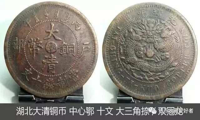 2、户部丙午中心鄂大清铜币十文“大”三角捺/部颁龙 “大”三角捺部颁龙等级八级,一枚普通品市场价值在百元左右,品相好一些的一枚可以过千元。