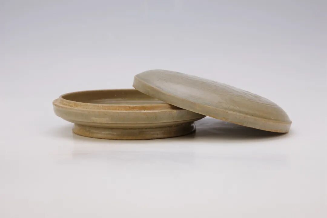 这件瓷粉盒的年代为北宋时期,其圈足高且外撇,盒身腹部外侧有一圈凸棱的特征与越窑寺龙口窑址出土的Ab型Ⅱ式粉盒相同,可判断其年代为北宋中晚期。