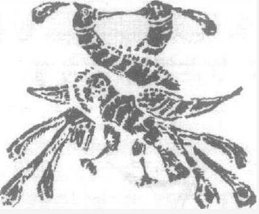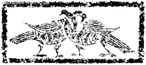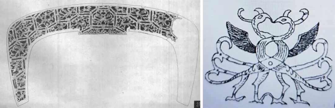 当然这类交颈鸟图案是有来源的,其最早的源头可以追溯到汉代墓葬的画像石上,例如徐州睢宁县汉墓画像石上有十分清晰的交颈鸟图像。有学者认为汉代墓葬画像石上的交颈鸟源自佛教传说中的共命鸟(一种生活在雪山的神鸟,一身两头)的变体,但共命鸟的形象多为双头一体,而且头部也多被描绘成为人面,与交颈鸟的差别很大。而交颈鸟应当是一雄一雌,是一种吉祥的象征,表达了汉代人民追求阴阳和谐、生活幸福的美好愿望,虽然不排除受到外来文化因素的影响,但与佛教的关系应该不大。汉代以后,交颈鸟的形象还出现在了其他器物上,例如辽宁北票喇嘛洞遗址出土的铜鎏金镂空鞍桥包片上。喇嘛洞遗址是十六国时期(304-439)三燕文化(十六国时期鲜卑族建立的前燕、后燕、北燕三个政权形成的地域文化)的代表性遗址,交颈鸟图案出现在马具上也从另一个侧面反映出它与佛教可能并无联系。