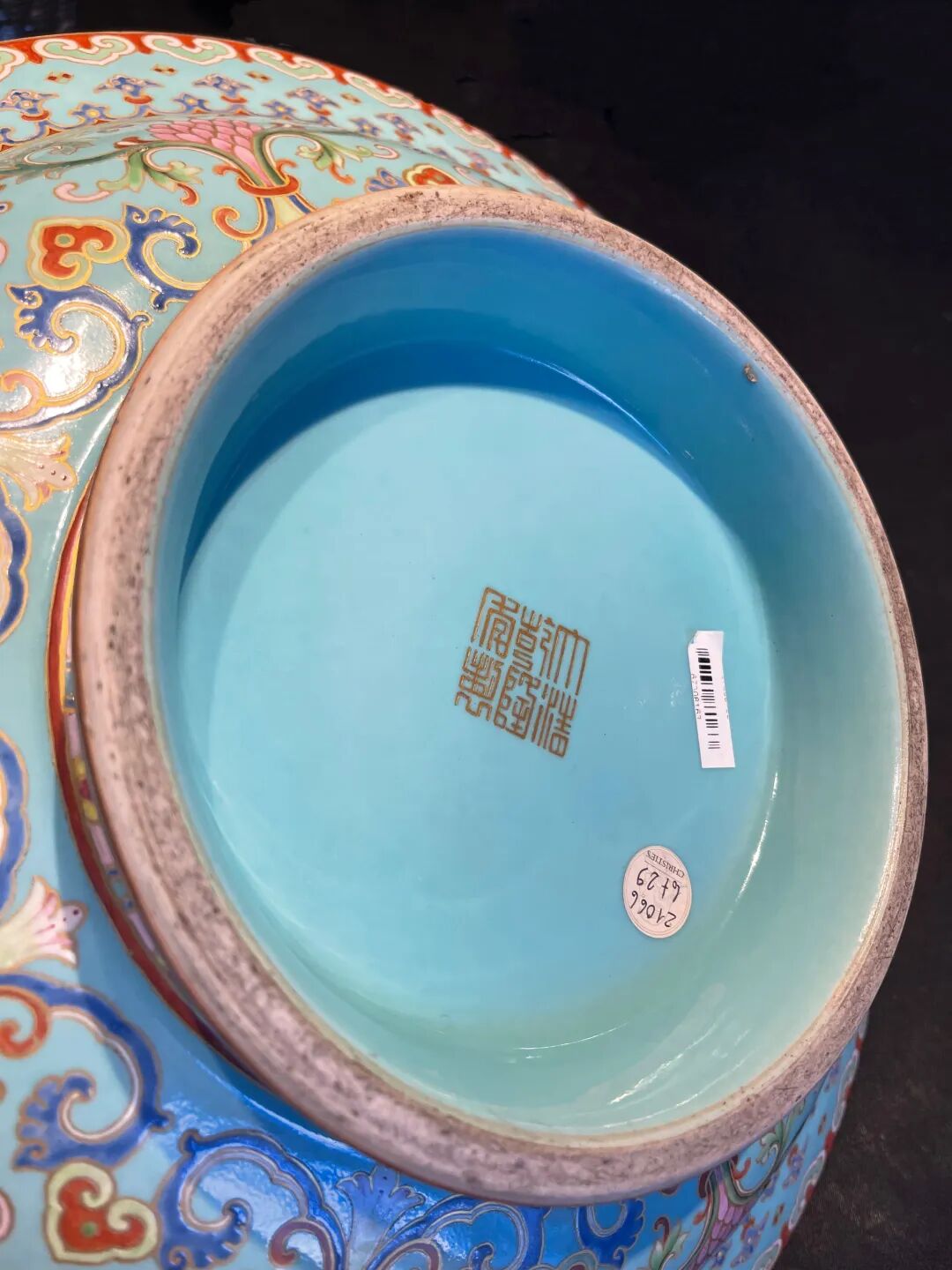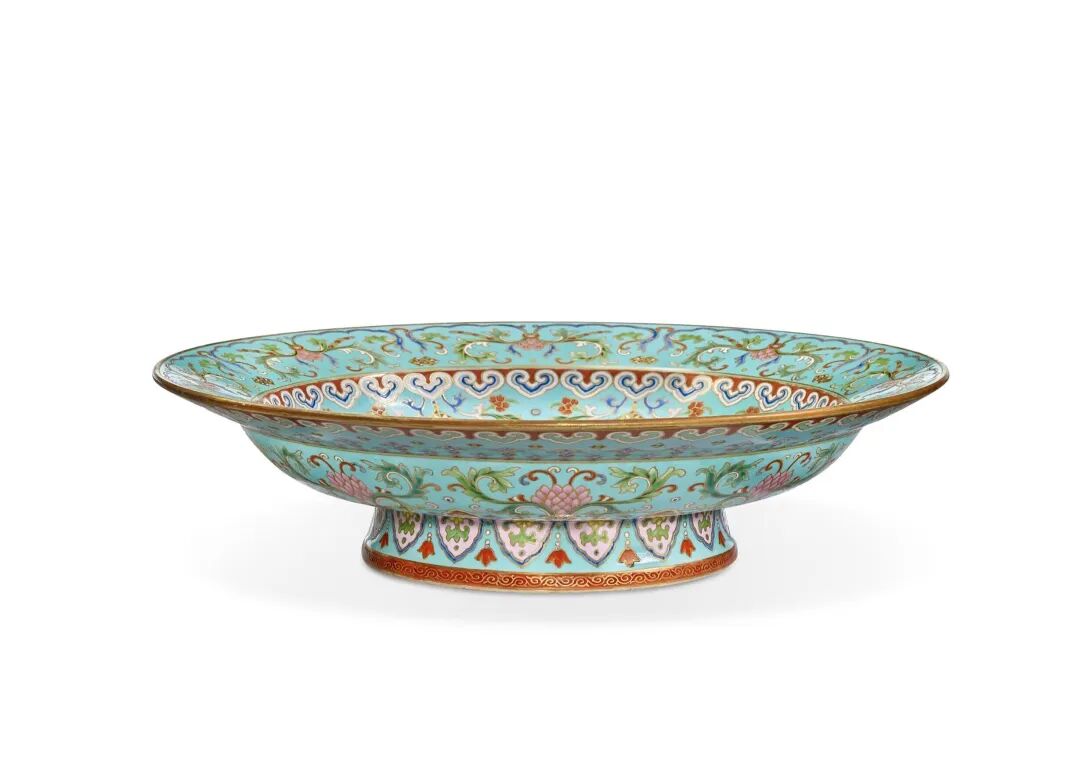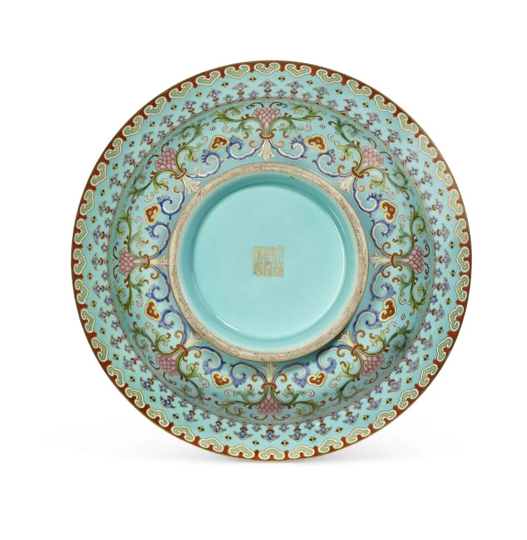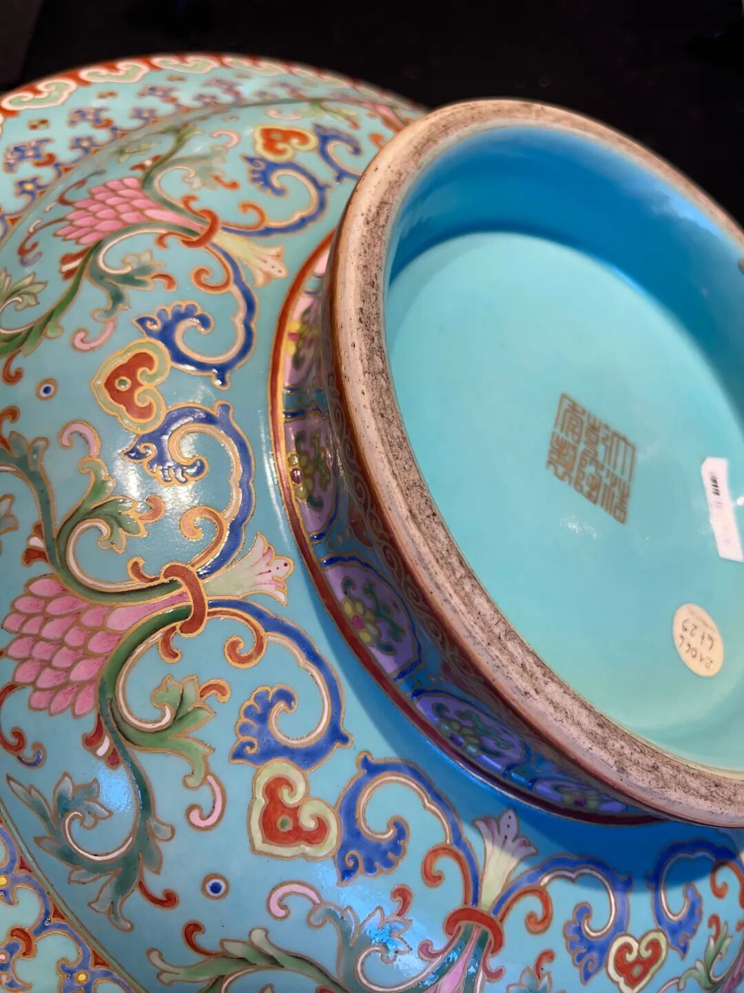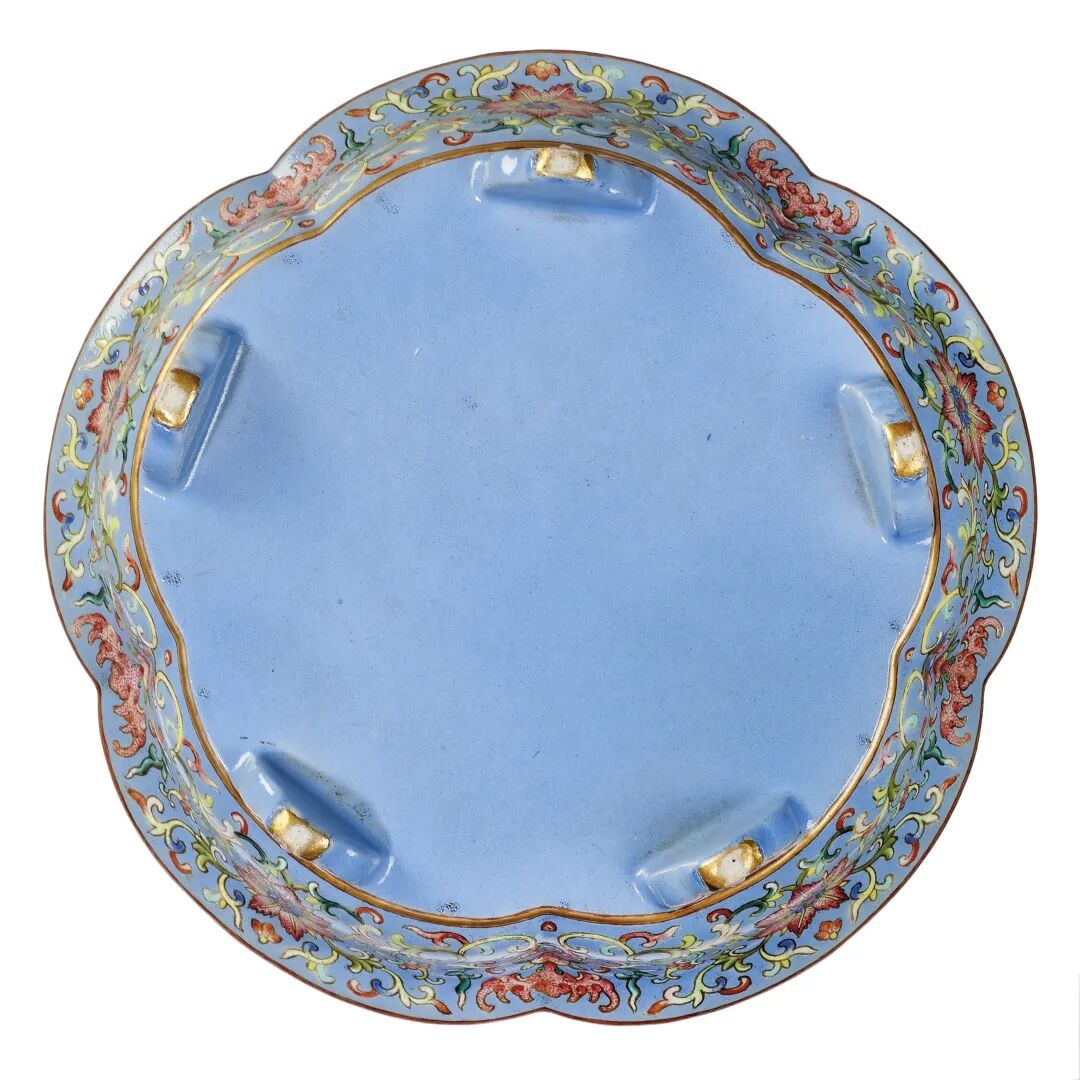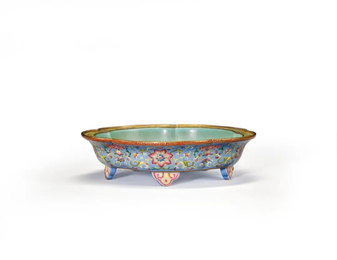 天蓝釉洋彩缠枝西番莲纹花式盆