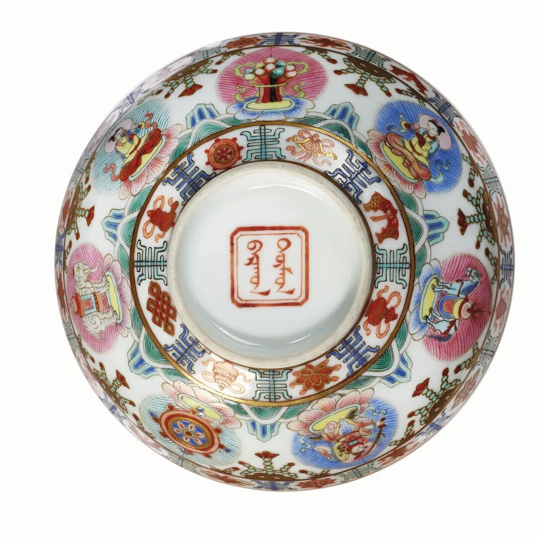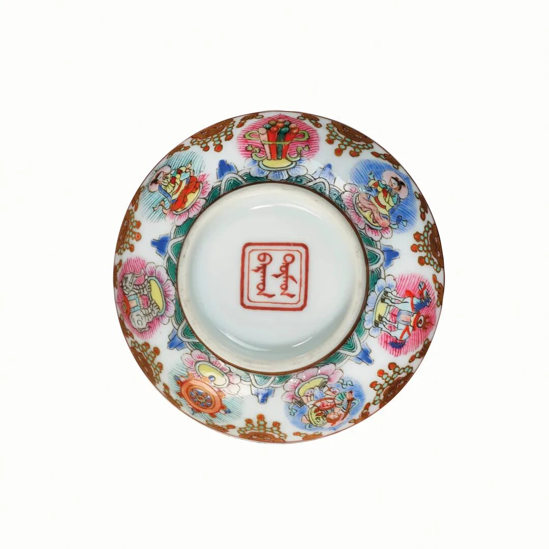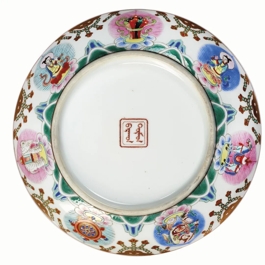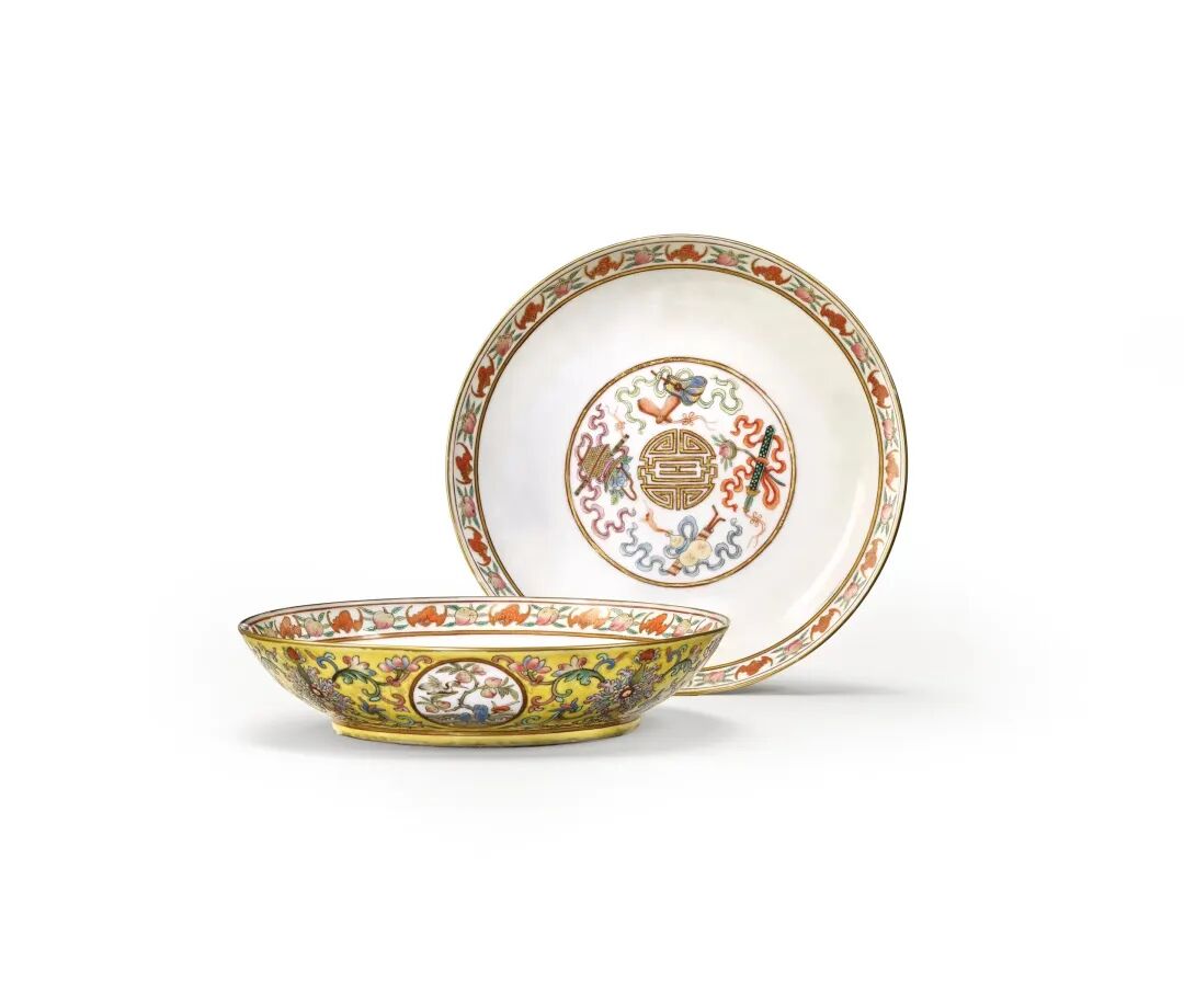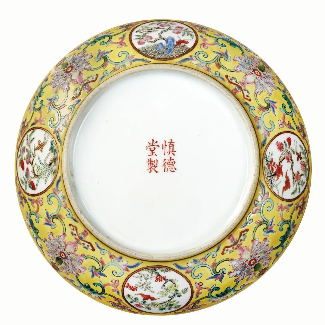 黄地粉彩缠枝莲纹暗八仙盘一对