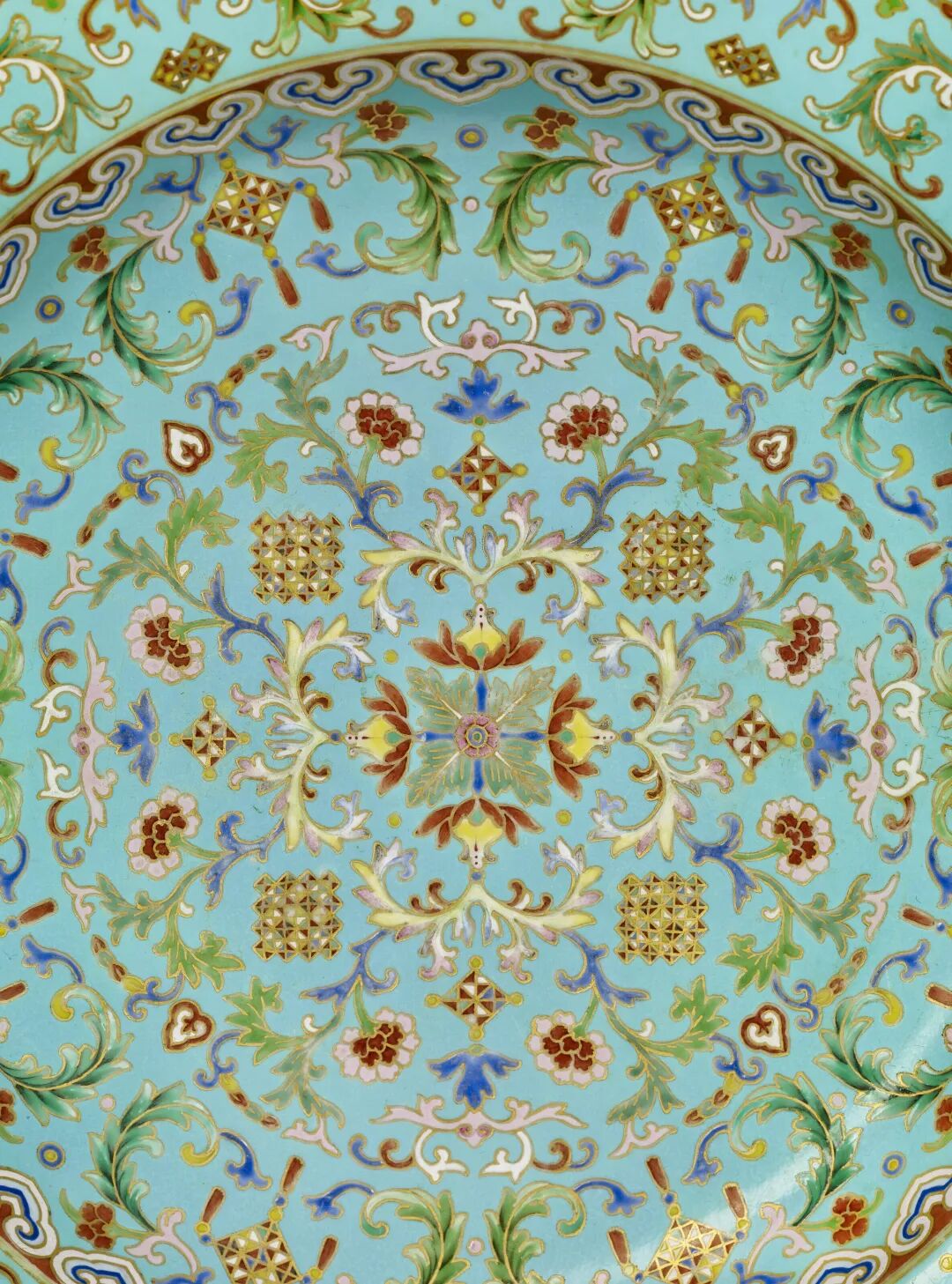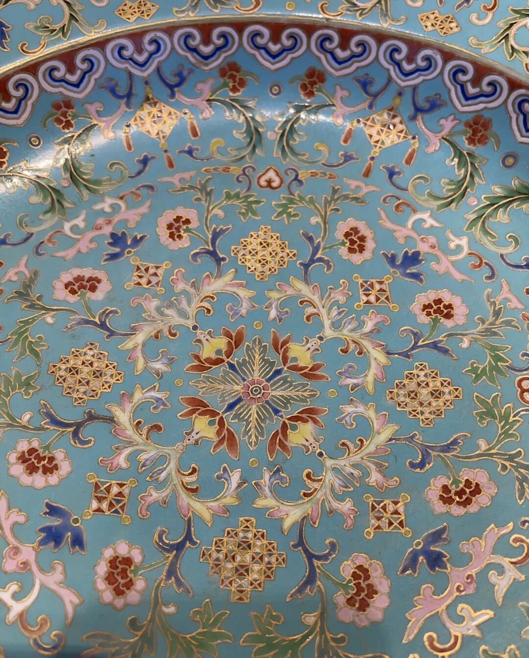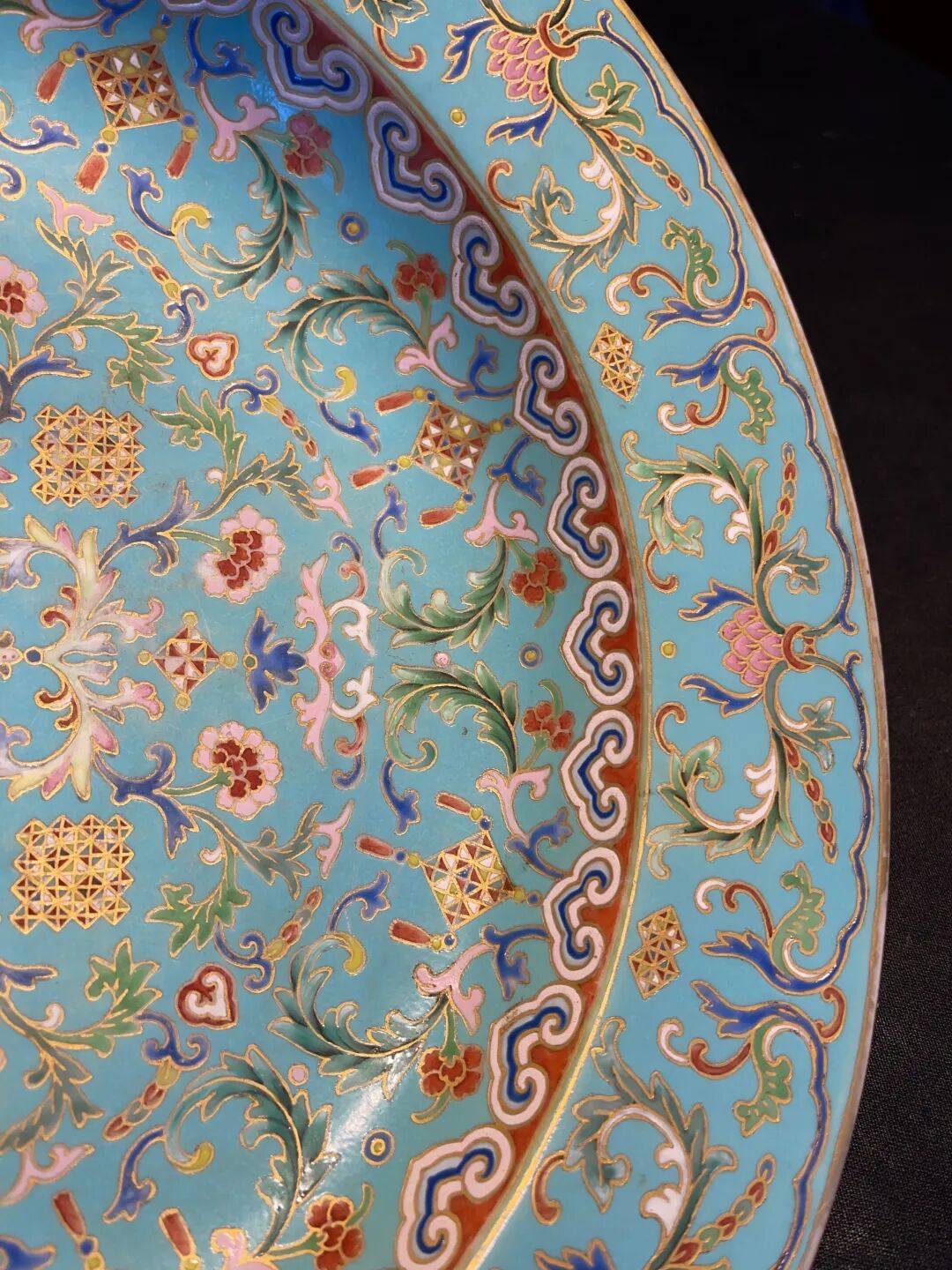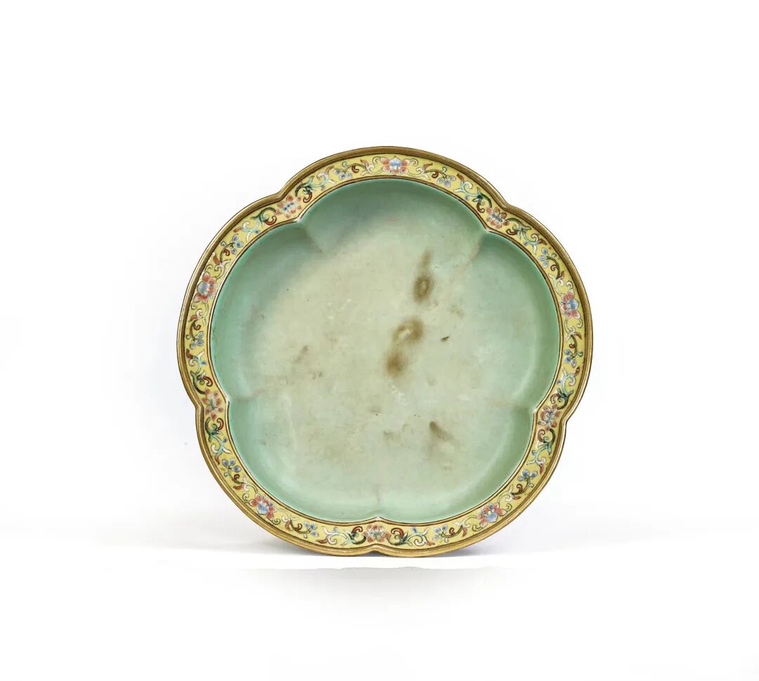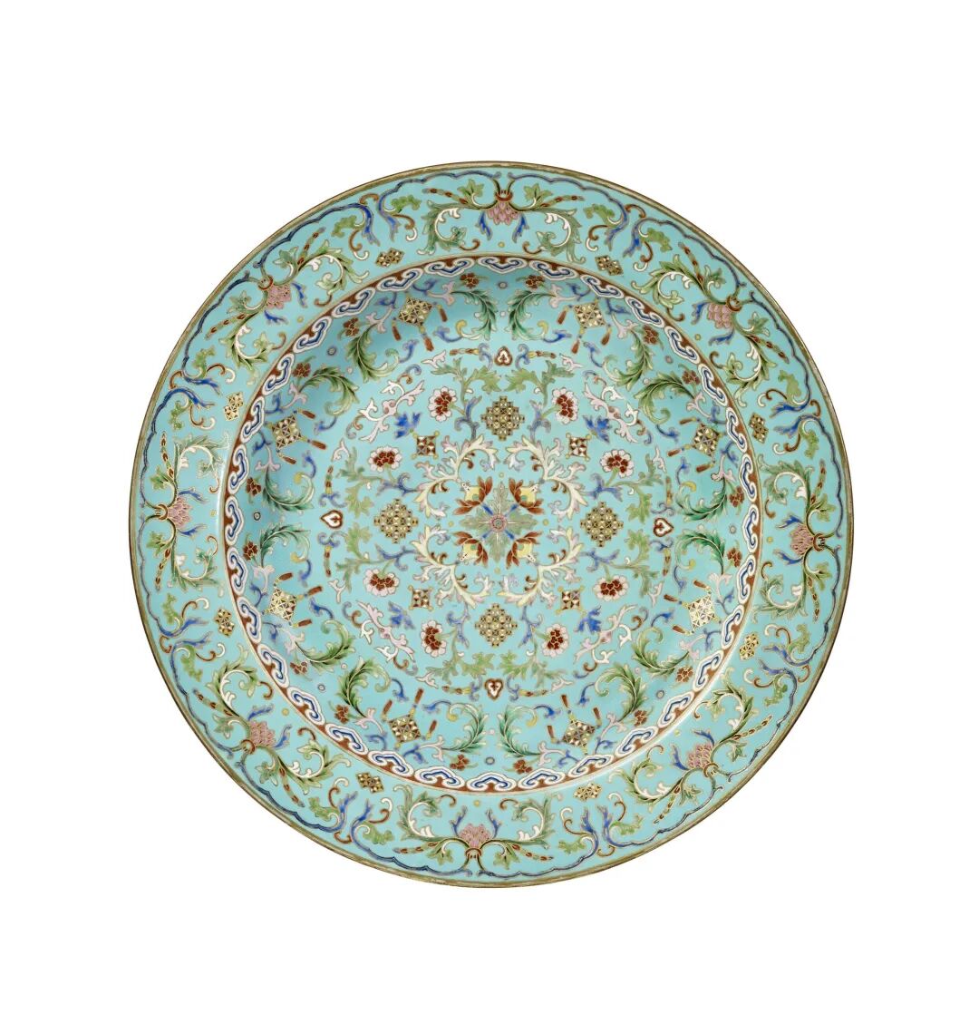 松绿地洋彩缠枝番莲纹仿掐丝珐琅折沿盘