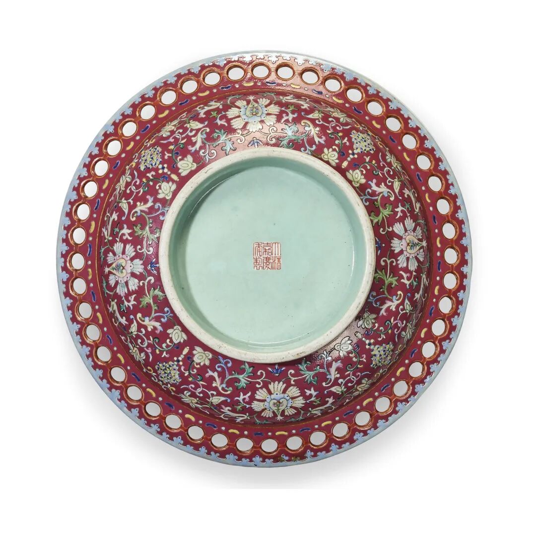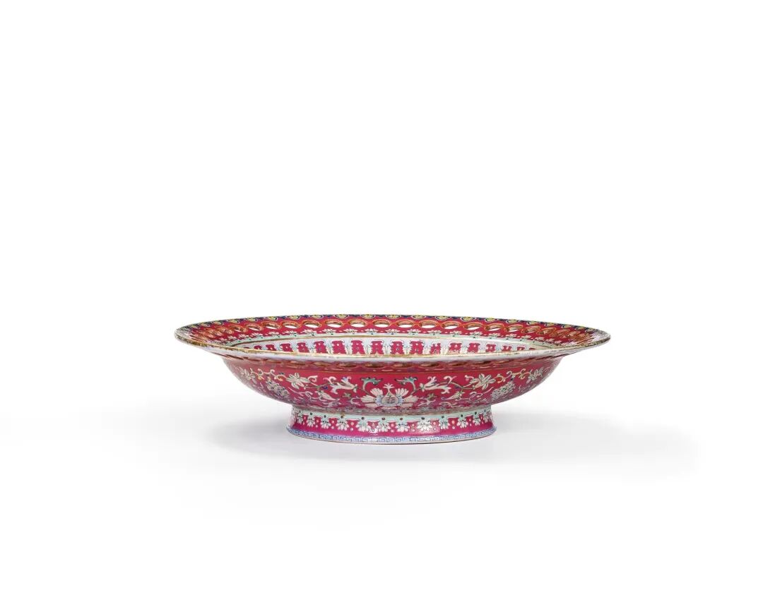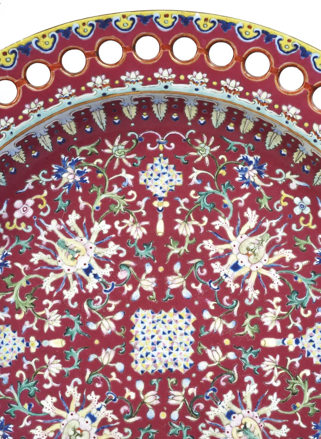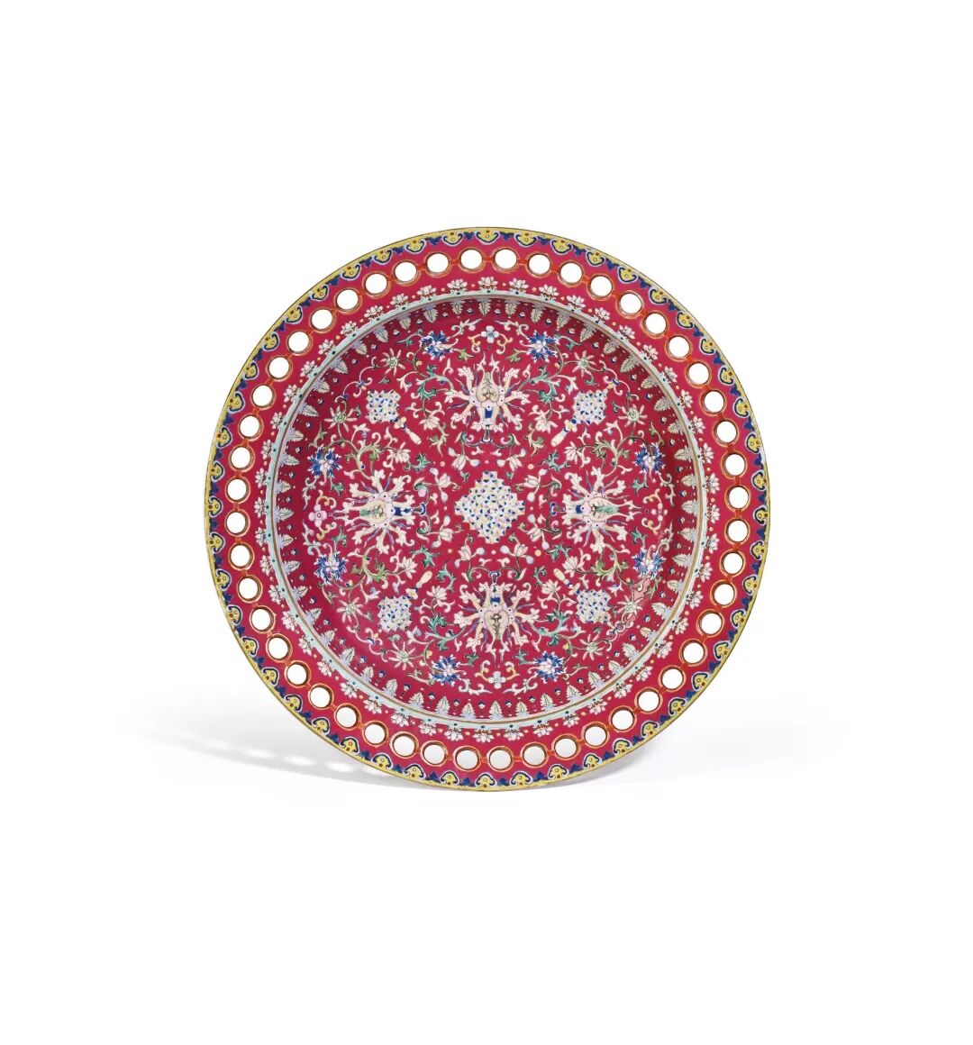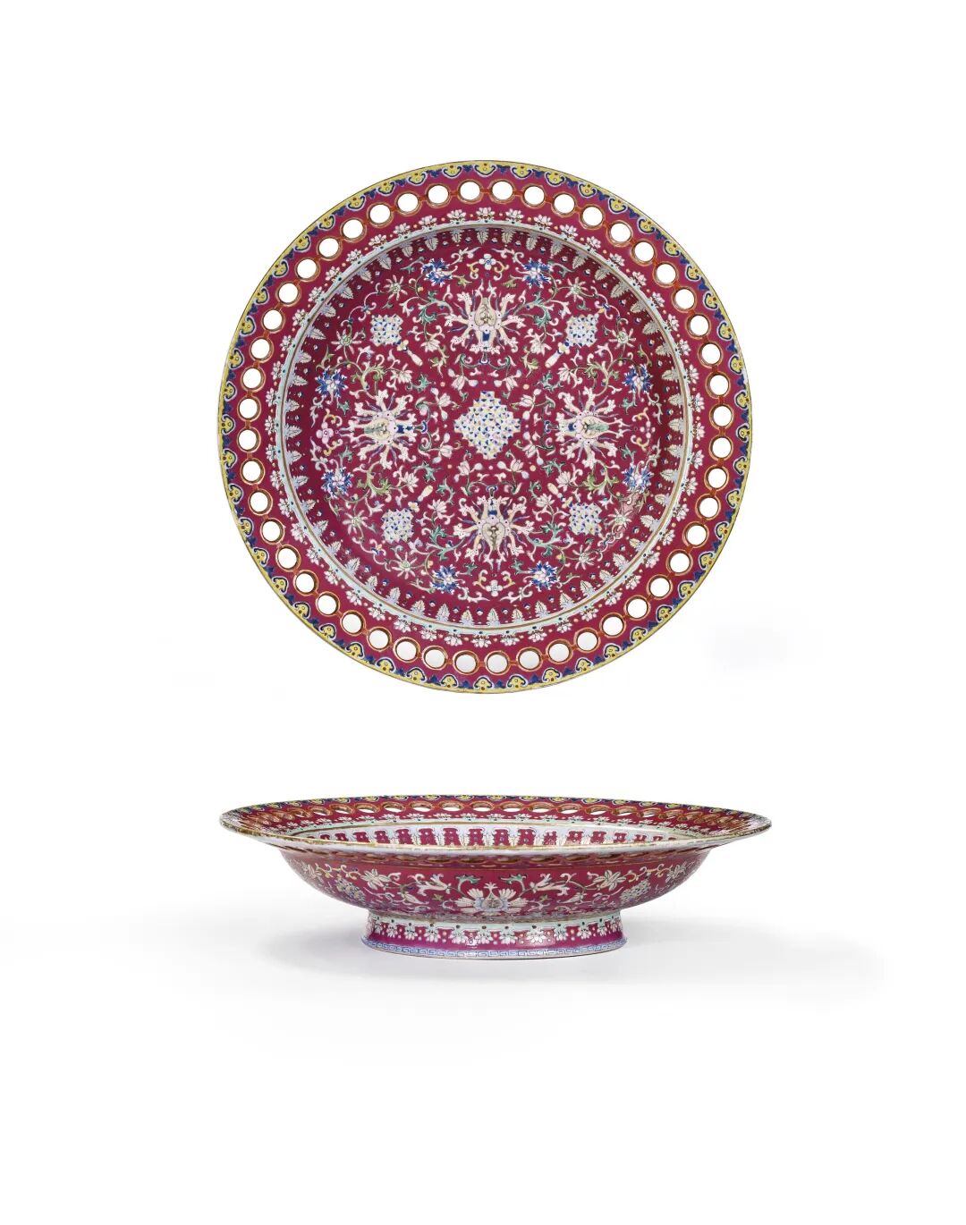 胭脂紫地粉彩番莲纹镂空折沿供盘