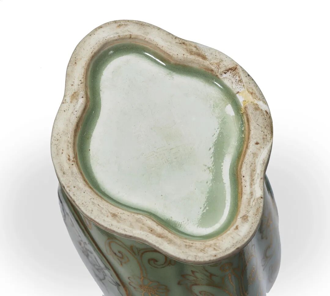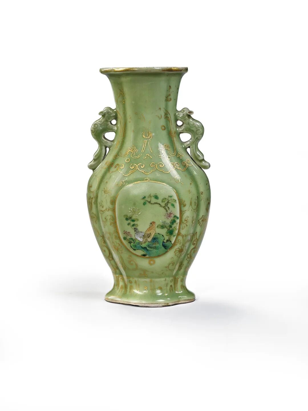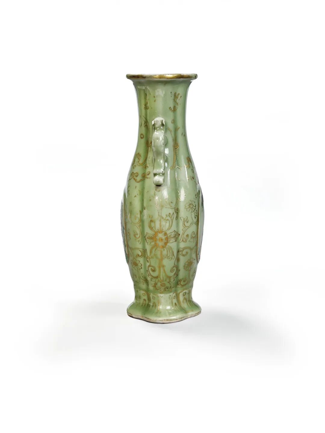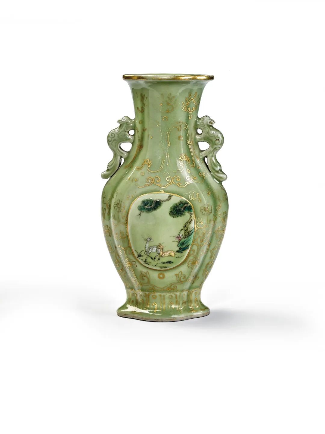 清乾隆 青釉描金粉彩灵鹿纹兽耳瓶