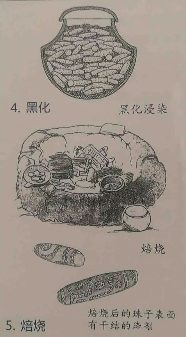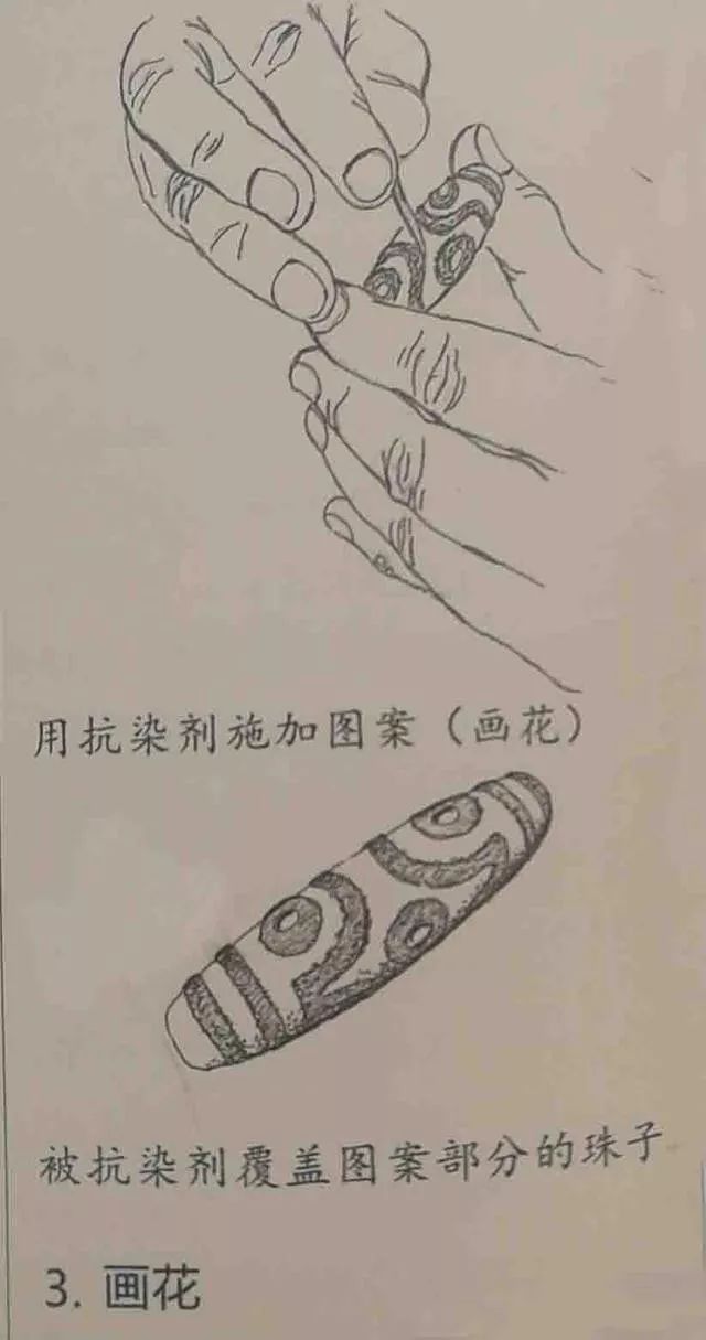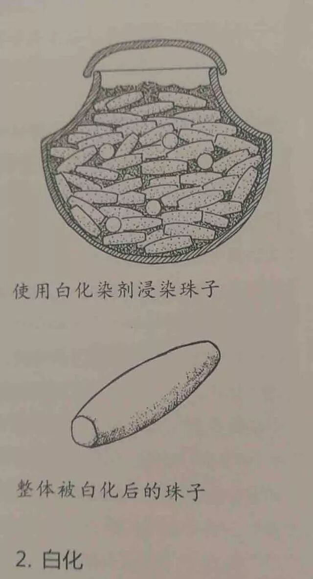 (在浸泡碱性溶液的天然玛瑙上经过加热使其白化,再用抗染剂绘画纹,浸泡在使其致黑色的溶液后再次加热培烧,使表面形成黑白分明的图案)