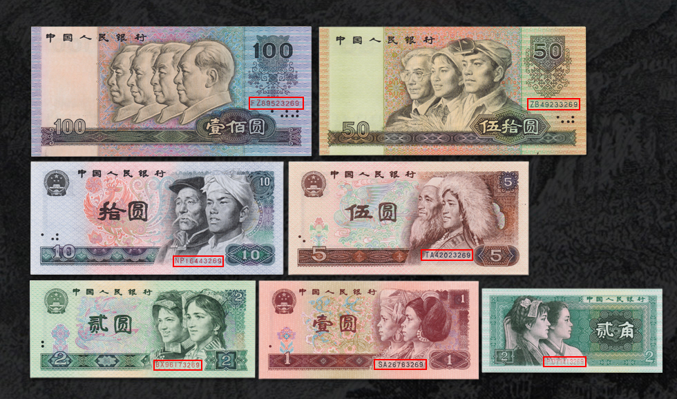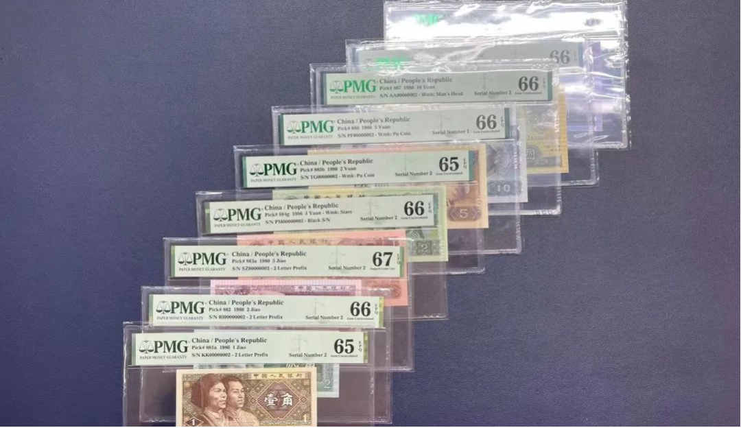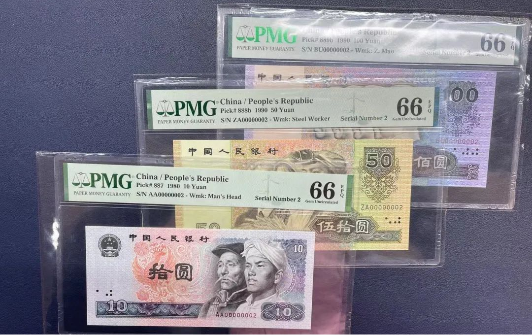 近期就有一套四套币价值已经达到了十万元,它是冠号极其特殊(均为00000002),且品相极好的9张小全套。