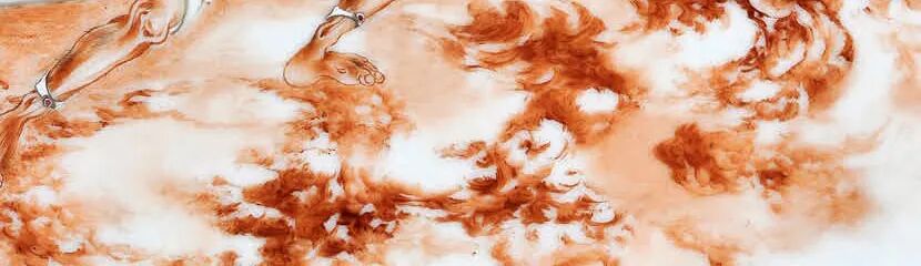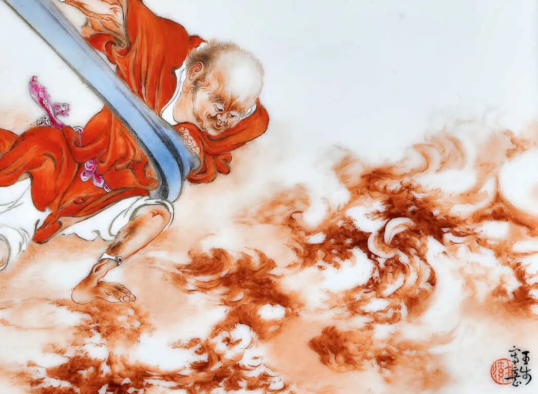 但见茫茫太虚,精气流动,充盈於天地之间,笔力紧劲联绵,循环超忽,风趋电疾,如梦如幻,如春蚕吐丝,绵延不绝,充满力量。一高僧秀骨清象,身披法衣,手足佩戴法器,两手奋力曳动法轮,凛凛然神明气远。巨大的法轮在云中依势翻腾旋转,法轮上以刀代笔,刻划出一个个重叠的小法轮,表现了茫茫宇宙绵延不息的观念。佛祖认为世间有三千大千世界,一个大千世界有一千个中千世界,一个中千世界有一千个小千世界,是故宇宙无穷无尽,生生不息。先生认为生而为人,渺小的个体面对浩瀚无垠的宇宙,就要修正自己的行为,就要法轮常转,不断提升自我。此处大小法轮,连绵不绝的表现手法,体现了先生精于描绘、刻划,娴熟地驾驭多种艺术表现手法的高超水准。