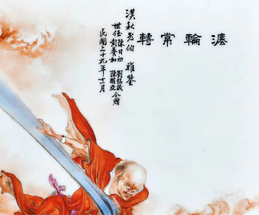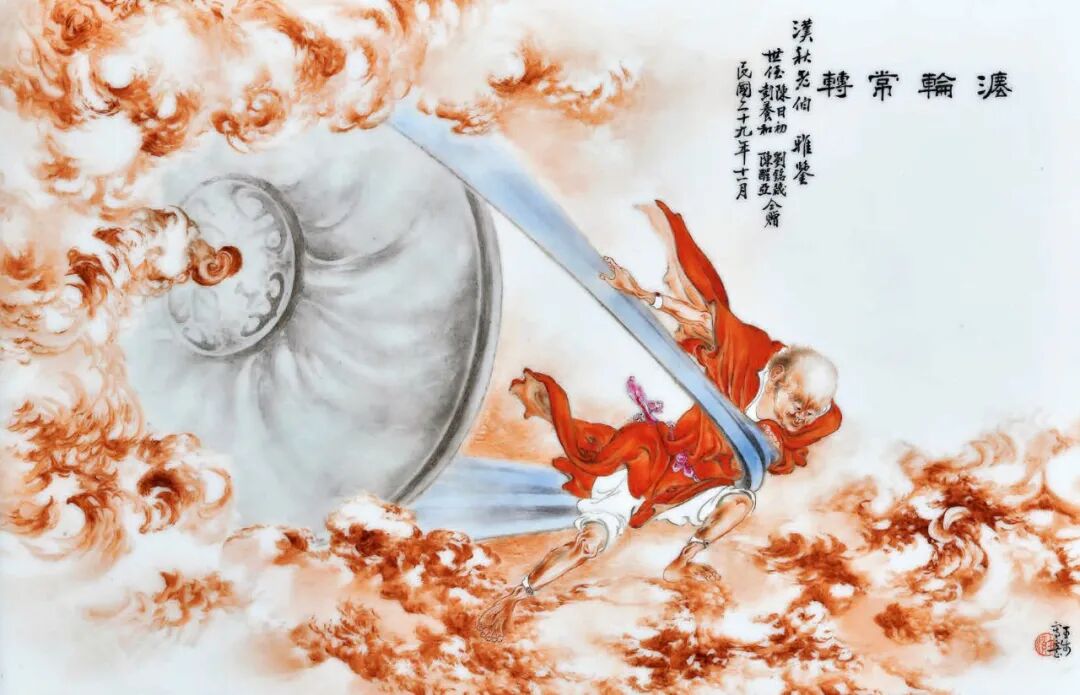 人生就是一场修行,于己无论顺境还是逆境,于大环境无论家国平安还是外敌侵扰,都要坚守初心。越是在苦难的时光,越要坚信光明不远,战争终会终结,和平会将到来,永远不要丧失信心和希望。星星之火可以燎原,希望的种子需要传播出去,传给大众,这个媒介可以是文学作品,可以是报纸,可以是广播,可以是战争檄文,可以是艺术作品,可以是瓷绘作品。于是,王步应时人的要求,创作了粉彩作品“法轮常转”。法轮常转出自《维摩诘所说经·佛国品》:“三转法轮于大千,其轮本来常清净。”法轮:佛家语,轮有二义,一为运转,一为摧碾,佛运转心中清净妙法以度人,且摧毁世俗一切邪惑之见。指佛法无边,普济众生。