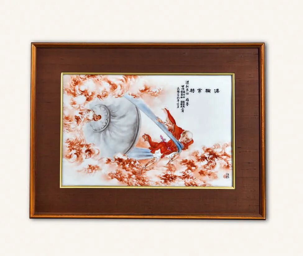世事无常,艺术无国界,这件“法轮常转”作品不知于何时飘洋过海到了美国加州小镇Palm Desert,藏于一对老夫妇Lars Nielson &Ron Beam手中。2020年瓷板的主人去世,其所留物品皆做遗产拍卖,一位疫情期间驻守美国的华人竞得此件拍品。众所周知,美国基督教徒较多,佛教徒相对较少,我想这对老夫妇应该是被先生的艺术感染力所感动而作此收藏,抑或本身就是虔诚的佛教徒,也未可知。斯人已去,往事不可追,但法轮常转的精神却永远昭示后人精进努力,不断完善自我。如今此作突破疫情重重阻挠,跨越千山万水,辗转回国,可谓完璧归赵,能够结此善缘,在中贸圣佳完整完美呈现,也算是流传有序,递藏清晰。