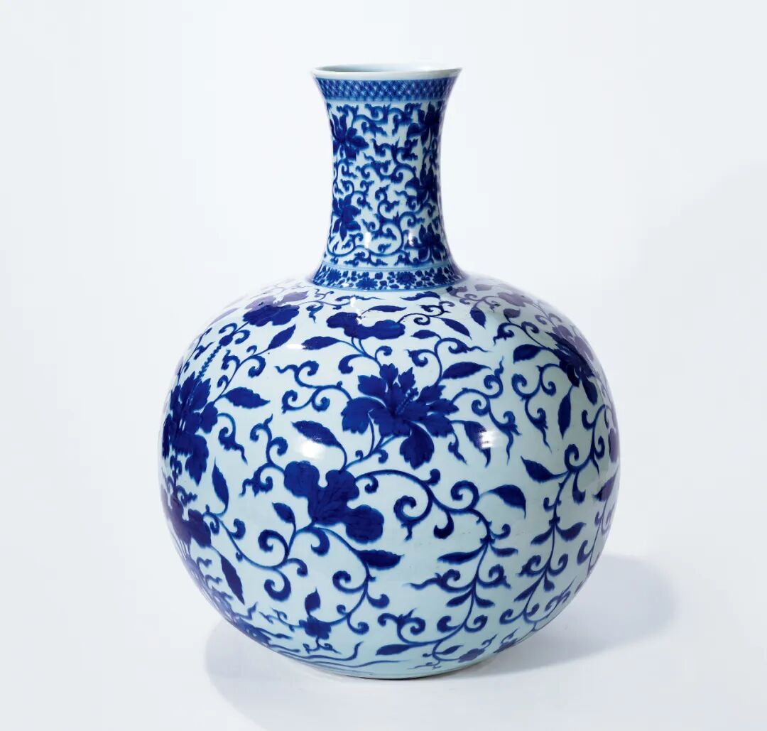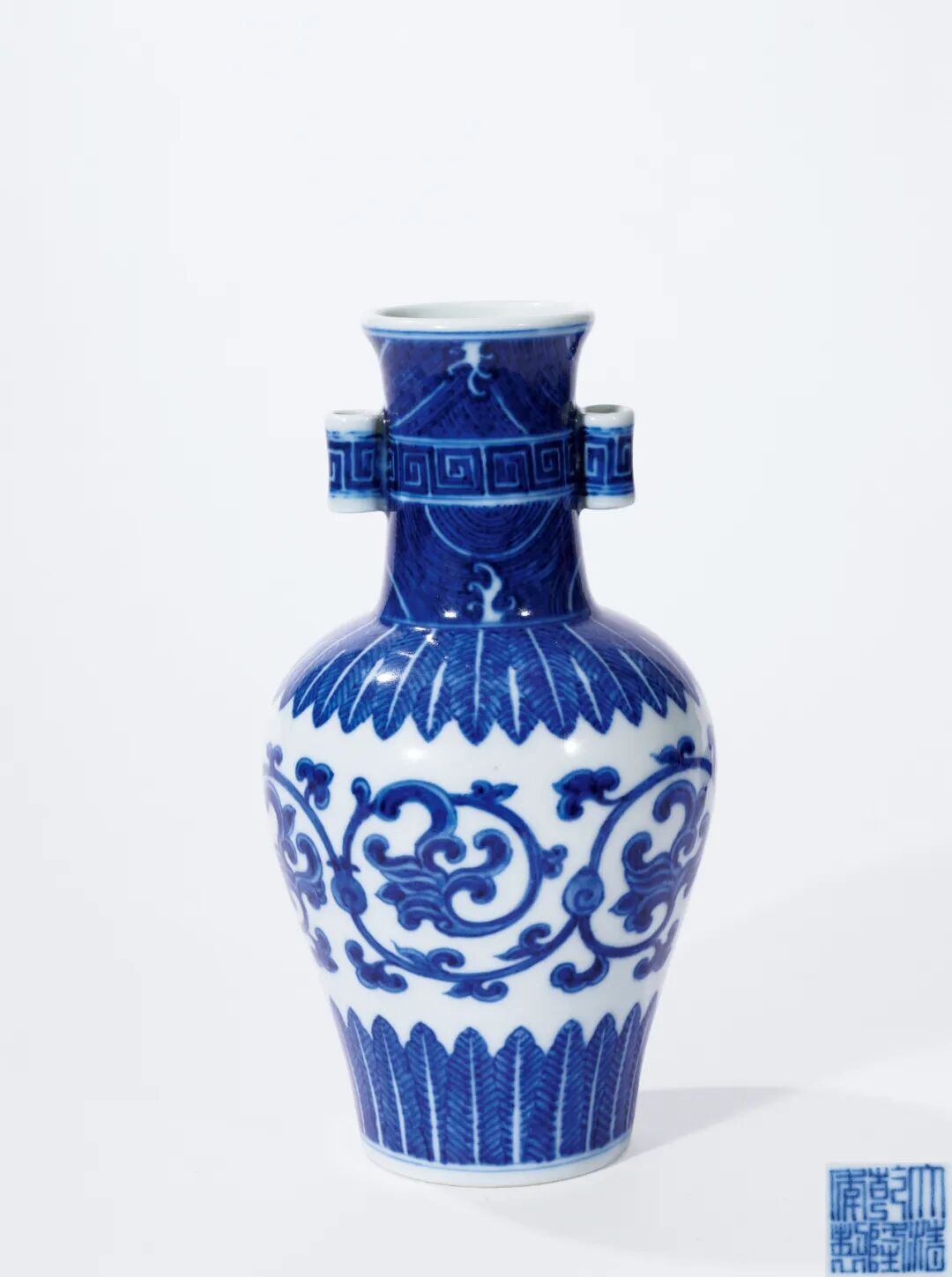 圆口,直颈,颈部两侧分设贯耳,丰肩,鼓腹下敛,圈足。内外满施白釉,外壁以青花装饰,颈部满绘蓝地留白海浪纹,其中以回纹一周连通双耳,肩部与近足处分饰覆仰蕉叶纹各一周,腹部绘缠枝花卉。为了模仿明初「苏泥勃青」铁锈斑的特殊效果,青花纹样局部以浓墨点染。底以青花书「大清乾隆年制」篆书款。雍正、乾隆慕古,唐英为迎合帝王喜好而多有烧造仿古器物。贯耳瓶从宋代开始流行,源于青铜旧制,仿汉壶样式,因在颈部两侧各设管状贯耳而得名。本拍品的原型应为明宣德时期的青花缠枝花卉纹贯耳瓶,清代雍正、乾隆、道光均有仿制,除了器形与纹样,还特意通过重笔点染的方式模仿永宣青花特有的铁锈斑,但其效果大小一致、分布非常有规律,较好辨认。参阅:《故宫博物院藏明初青花瓷》,北京,2002年,卷1,图版82