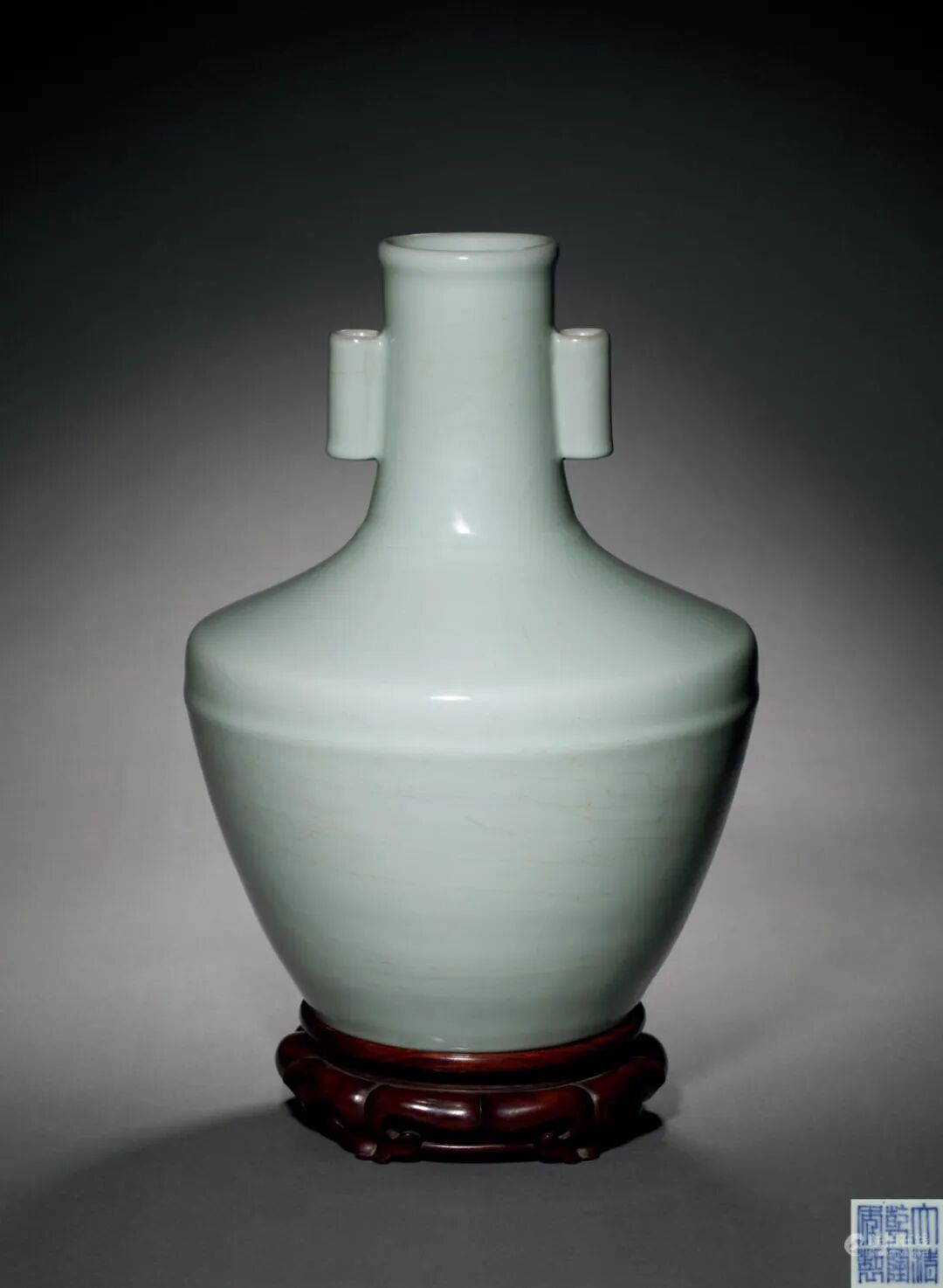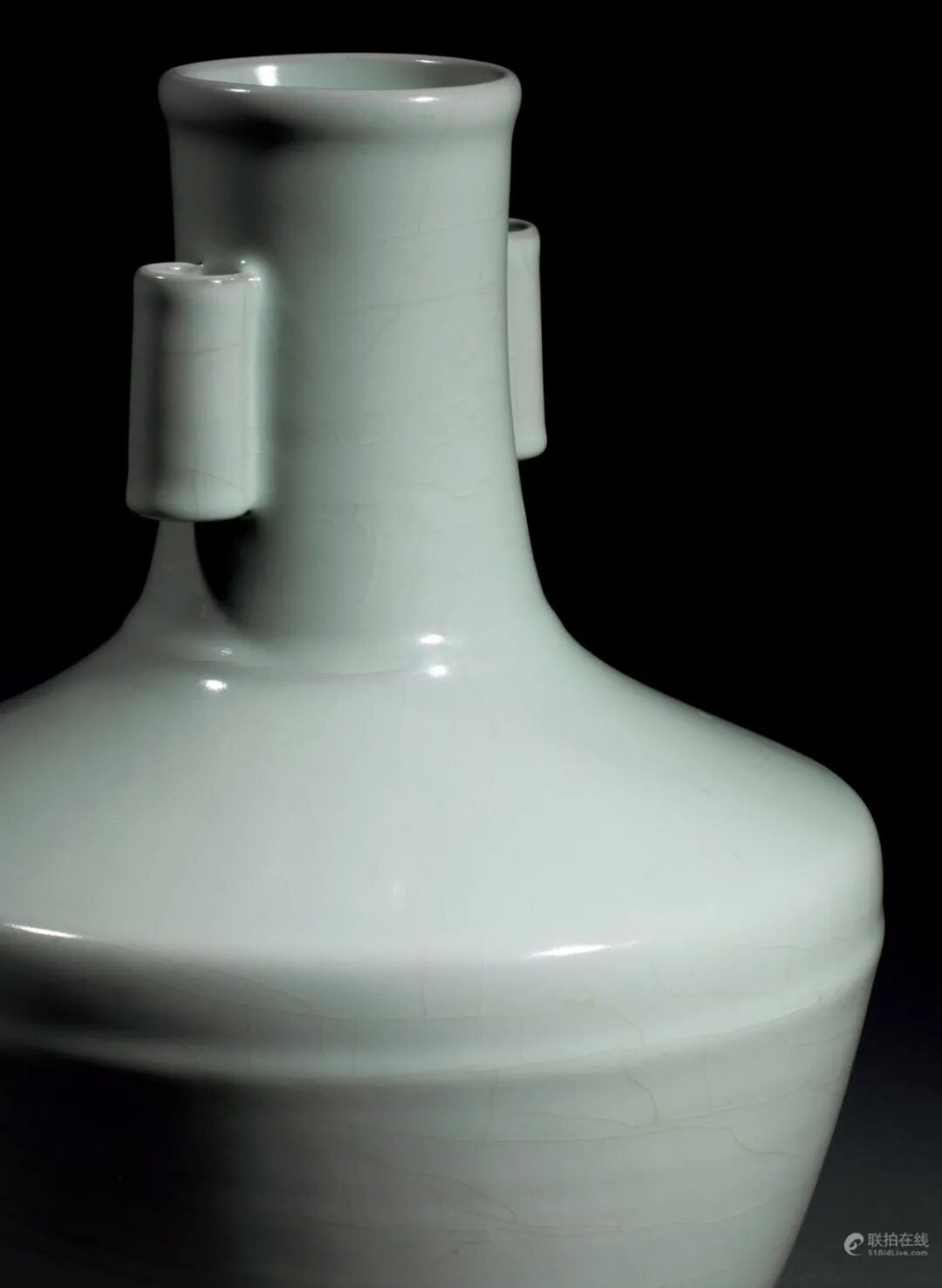 拍品估价:2,600,000 - 3,600,000 人民币《清宫瓷器档案》明确记载,乾隆三年七月初一日交大观釉放大腰元双管瓶一件。此件贯耳弦纹尊即是清代乾隆仿官釉瓷器的经典佳作之一。见尊盘口,束颈,颈部对称饰贯耳一对,斜肩,鼓腹下敛,圈足。器型古朴,瓷质精细,满施仿官釉,釉色匀净淡雅,柔和悦目,釉下开片,釉质滋润,疏朗大方,器底署“大清乾隆年制”三行六字篆书款,为典型乾隆朝仿官釉精品,正值乾隆初期唐英督陶鼎盛之作。