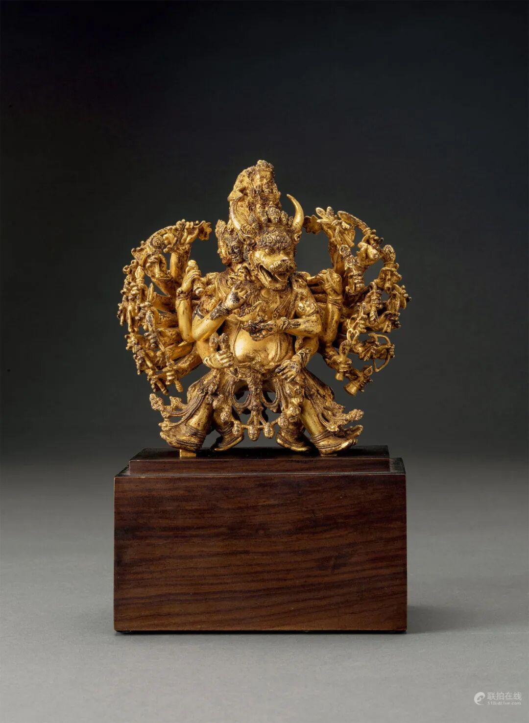拍品估价:800,000 - 1,200,000 人民币本尊明永宣御制铜鎏金大威德金刚或称为怖畏金刚,是文殊菩萨的愤怒化身,为末法时期的护法神,立于铭刻有「大明永宣年施」款的双层莲座上,全身赤裸,共有九个头,怒目瞠视每个方位,正面主要的牛头,现狰狞恐怖相,怒发如火焰般冲天,牛头最上层为代表智慧的文殊菩萨,34臂持着各式各样的降魔法器,主尊双肩和圆腹之间卷蛇缠绕,身披人头组成的璎珞,16足踩踏死神阎魔以及排成四列造型殊异的鸟兽恶魔,以此威吓之势来摧毁对于死亡的恐惧以及充满无明的愚痴。大威德金刚铸造极为繁复精细,比例适切,空间安排完美,体内嵌有装藏物,并以薄板封存,隐藏在身后卷蛇下方,为目前所见永宣时期唯一一件单独铸造的鎏金铜大威德像。此拍品超越一般复杂的永宣宫廷雕塑,绝对是一件天才级大师的旷世绝作。造像铜质细腻,鎏金纯厚,装饰华丽,工艺精美。造型繁缛,结构复杂,比例合度,舒展自然,气韵生动,尤其是威猛的气势、生命的活力和宗教的空灵令人叹为观止,充分体现出汉藏文化的融合和明初日益强大的实力。此件大威德金铜金刚造像即体现出明代永宣宫廷藏传佛教艺术流派的显着特点:鎏金纯厚、华丽大气、比例精准、造型繁而不乱,至今未见能超越此尊造像者。