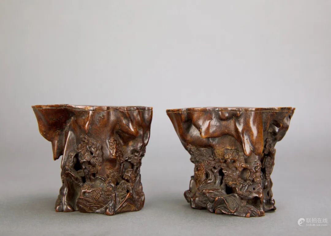 Lot 1536 明末清初 伽楠香雕楼阁松竹杯(一对)拍品估价:800,000 - 1,200,000 人民币明代和清代中前期,宫中常用贵重木材制成笔筒、笔插、笔搁、如意、瓶等,工艺精细,与犀角制作相同。此件迦楠杯选用一段沉香木雕琢而成,审其形制,与同时期之犀角杯,无论流行题材还是雕刻技法均极为相似,为仿角杯作品中的杰出典范。此杯上敞下敛,杯腹内收,口沿及底足呈不规则椭圆形,仰马蹄状造型。杯外壁雕山岩凹凸嶙峋,并以浮雕及镂雕技法刻画老树数枝,苍松如轮。枝干遒劲有力,旁逸斜出,巨石奇峻,气势不凡。刀法深浅有致,沉稳细腻,巧妙结合沉香木质本身之纹理枝节,以浮雕的手法表现出松下高士图,古松苍莽挺拔,松针如扇,松针浮雕精细入微,高度立体,布局和谐得当,设计制作精巧,刀法流畅,匠心独运。