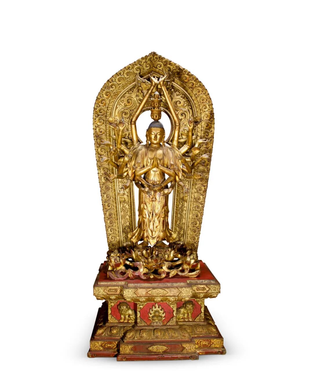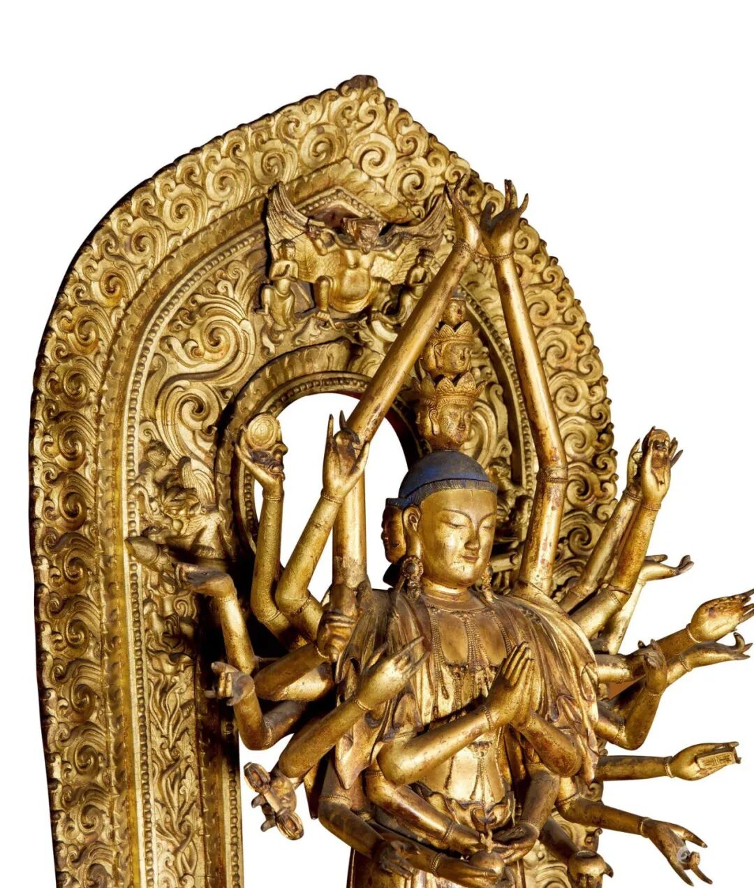 Lot 1524 清康熙 京造宫廷木雕髹金漆准提观音拍品估价:800,000 - 1,200,000 人民币菩萨曲线流畅,宽肩平腰,身形壮硕稳重。木胎扎实,通体漆金,充满宗教信息,为清代康熙时期宫廷木雕造像中难得一见的精品。