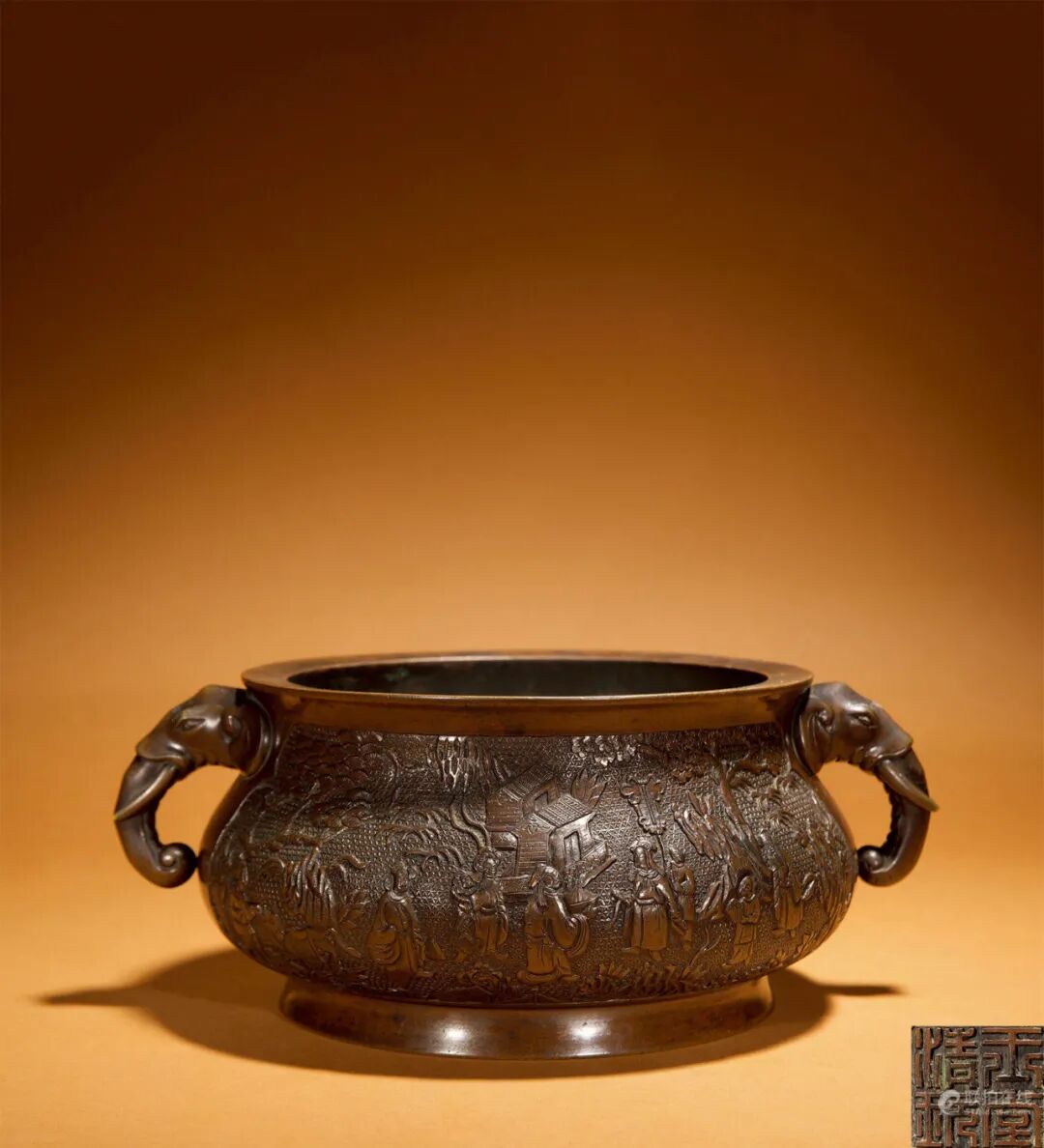 拍品估价:600,000 - 800,000 人民币此炉以精铜熔铸而成,作簋式,平口,唇微外撇,束颈,肩两侧对铸象首耳,炉身作低垂腹,腹部浮雕龙纹人物,细致入微。造型端庄稳重,尤其经繁复多层的剔刻,尽显早期时期不计工时、物尽其美、奢华繁缛的造型和工艺特点,錾刻工艺几尽精微,线条熔铸流畅饱满,圆润劲挺而富有弹性,体现了清代铜炉优美的线条感。通览此炉,外底署“玉堂清玩”四字二行篆书款,其通体色泽沉稳古雅,包浆盈实亮丽,当为清早期浮雕炉系列精品。