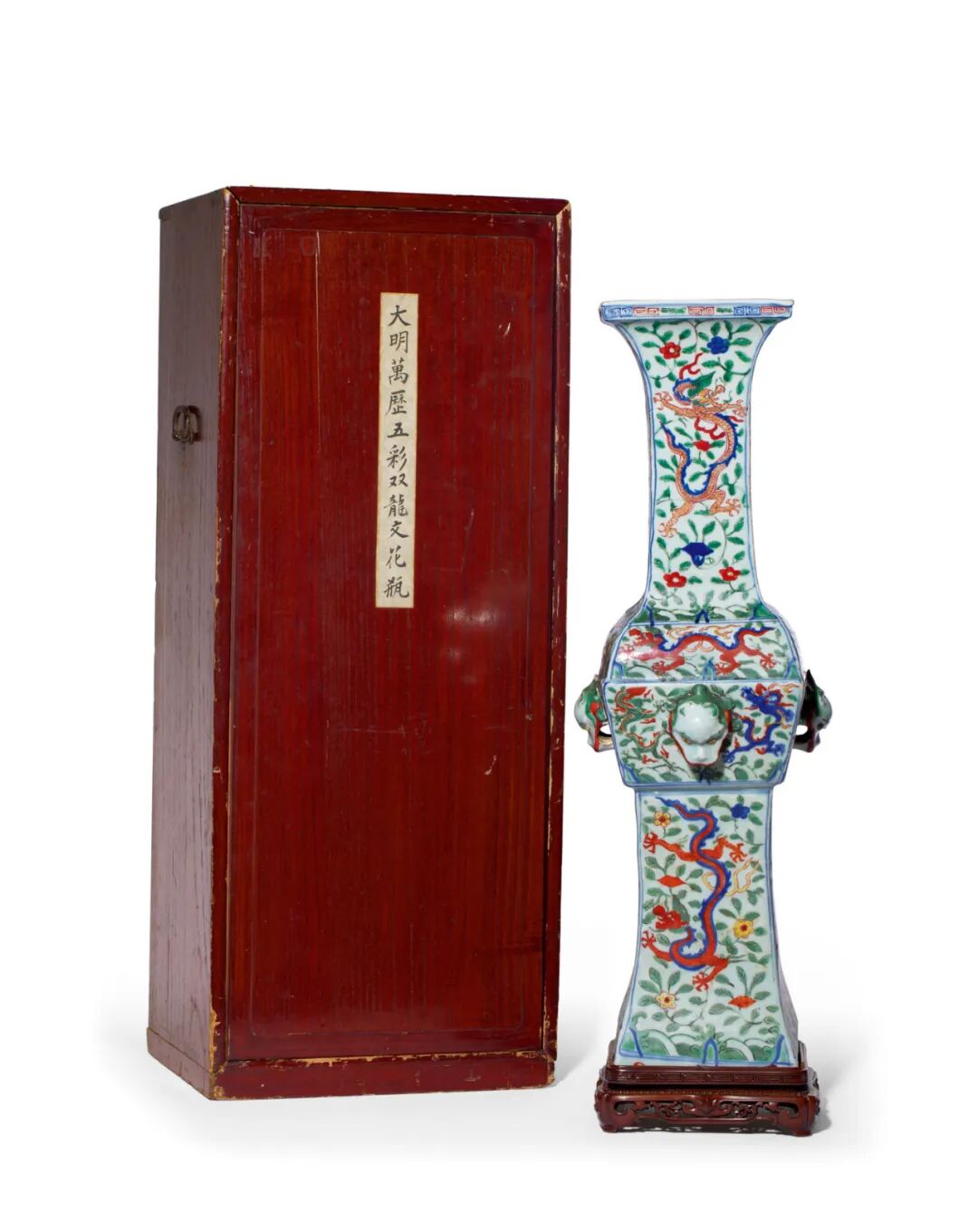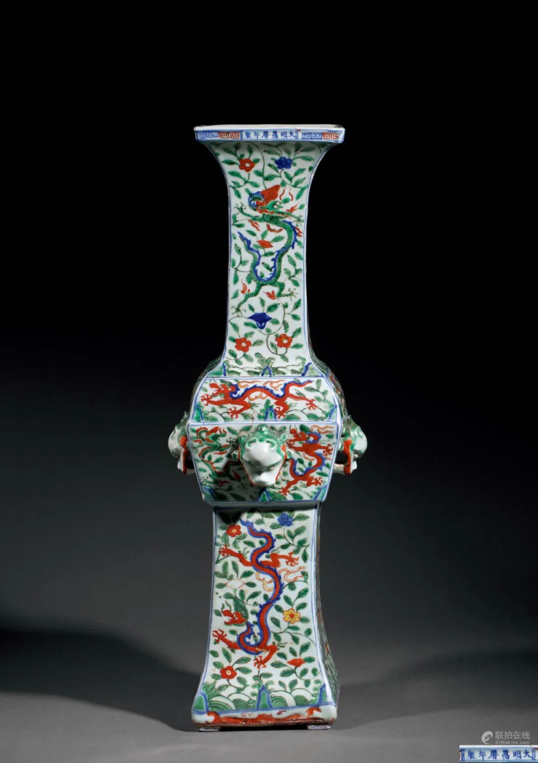 Lot 1516 明万历 青花五彩穿花龙纹四方花觚拍品估价:650,000 - 850,000 人民币1.山中商会,《中国古陶金石展观》,大阪,1928年,图453;2.保利艺术博物馆,《皇家气象——元明清宫廷遗珍展》,北京,2012年,页14;3.时间博物馆,《御赏拾珍—元明清官窑瓷器珍藏》,北京,2015年,第38-39页;4.山中让、金立言,《山中商会经手中国艺术品资料汇编》,上海,上海书画出版社,2019年,卷一,第258页,编号453;5.金立言,《东瀛遗珠——山中商会及日本旧藏名窑瓷器》,北京,北京工艺美术出版社,2020年,第160-161页,编号59;6.保利艺术博物馆,《龙翔九天——元明清龙纹御用瓷器展》,2020年,编号28万历五彩素负盛名,以红绿二彩炽烈取胜,对比强烈,夺人心魄,此式四方五彩腾龙花觚当为其中杰出之代表,造型朴拙古雅,胎体厚重坚致,外壁口沿绘一周回纹,其中一面双方框内书写“大明万历年制”楷书横款,笔道遒劲,古拙稳健。觚之上部与下部四面皆绘以五彩寿山福海腾龙纹,八龙姿势各异,升降交错,动感强烈。觚之中部四面皆贴饰兽首,模印精湛逼真,与诸彩搭配之下倍觉威猛有神。兽首两侧装饰对称升龙,上部则是赶珠腾龙,底部四侧模印出类似明式木座的式样,典雅尊贵,颇见精致之气韵。底部浅足无釉。其施彩风格豪迈,繁缛华丽,色泽浓妍,变化丰富,红彩苍雅深沉,一如枣皮之色,为典型的万历特征,绿彩厚润而翠意闪现,极具厚实质感,绝无晚清仿品之飘浮黯淡,黄彩鲜明而不俗,仿若金箔贴附。笔意稚拙可爱,诸彩相配得当,相互辉映。所见诸龙飘逸灵动,极具神采,自有万历时期粗犷之风格。《匋雅·卷下十三》赞曰:“万历五彩,草昧初开,往往显其拙相,……皆非寻常匠手所能几及。”本品之面貌正是对前贤感悟的最佳诠释。参阅: