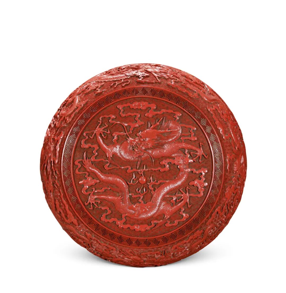 拍品估价:450,000 - 650,000 人民币参阅:纽约苏富比2006年秋季拍卖会,Lot 0066《清宫瓷器档案》明确记载,乾隆二十六年十月初九日杭州织造西宁本身来京进单,(交圆明园)雕漆九龙捧盒贰对。此类大型龙纹漆盒,存世罕见,本盒造型硕大,雕饰精致繁丽,出类拨萃,就有可能出自宫廷。雕龙双目炯炯,獠牙锋利,神态威猛,龙爪分张利落,龙须飘展;龙身披细麟,穿梭祥云,苍劲矫健。龙游祥云江水波涛之上,威武雄健,气宇万千。