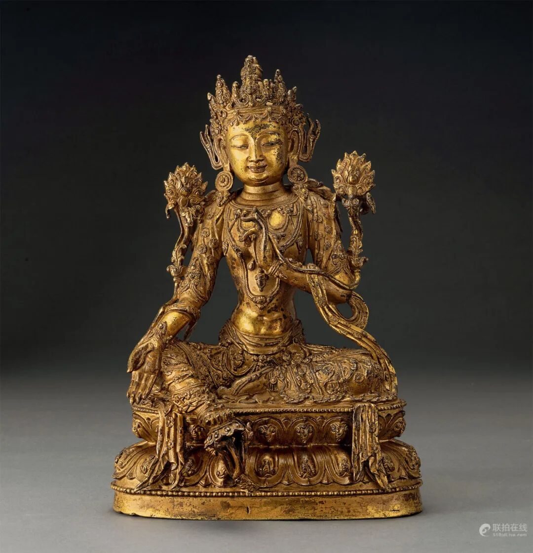 拍品估价:1,800,000 - 2,600,000 人民币绿度母为观世音菩萨的化现,全称圣救度佛母。是一位善良多情、助人为乐的菩萨。据说供奉绿度母能解脱八种苦难,即狮难、象难、火难、牢狱、贼难、非人难,所以又称绿度母为救八难度母。绿度母右舒坐于莲花座之上,左手当胸结说法印,右手置膝上施愿印,双手各牵一束莲花,分别开于左右肩。左腿横盘,右脚踏莲花,体态阿娜多姿。头戴五叶宝冠,耳饰圆铛,缯带在耳际上扬,余发披肩。面相方圆丰润,弯眉细目,双目俯视,表情祥和。上身袒露,宝冠、项链、璎珞、臂钏、手镯、足镯及腰带等具全,下身着长裙,束腰仰覆式莲花座,上缘一周硕大的连珠纹,莲花瓣挺拔秀长。整尊造像造型优美,做工极为精致,实为一尊难得的明代佛像精品。